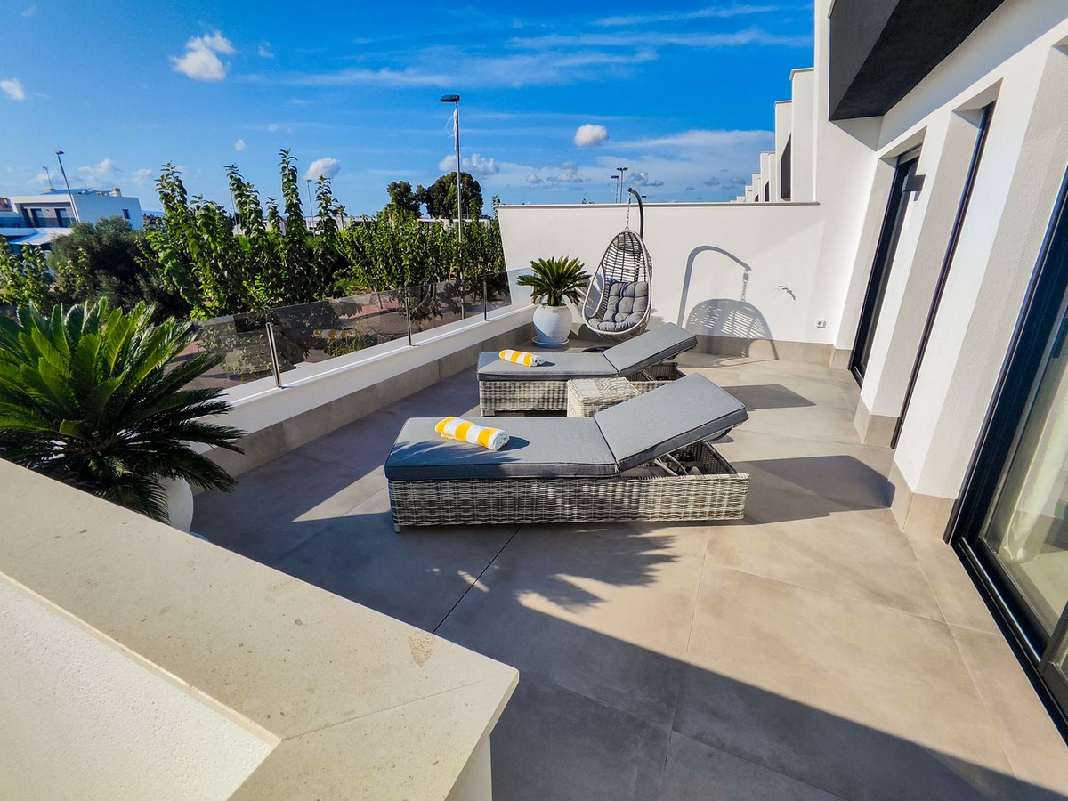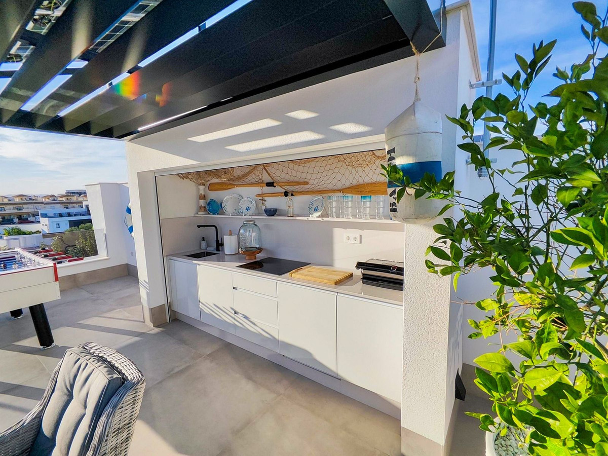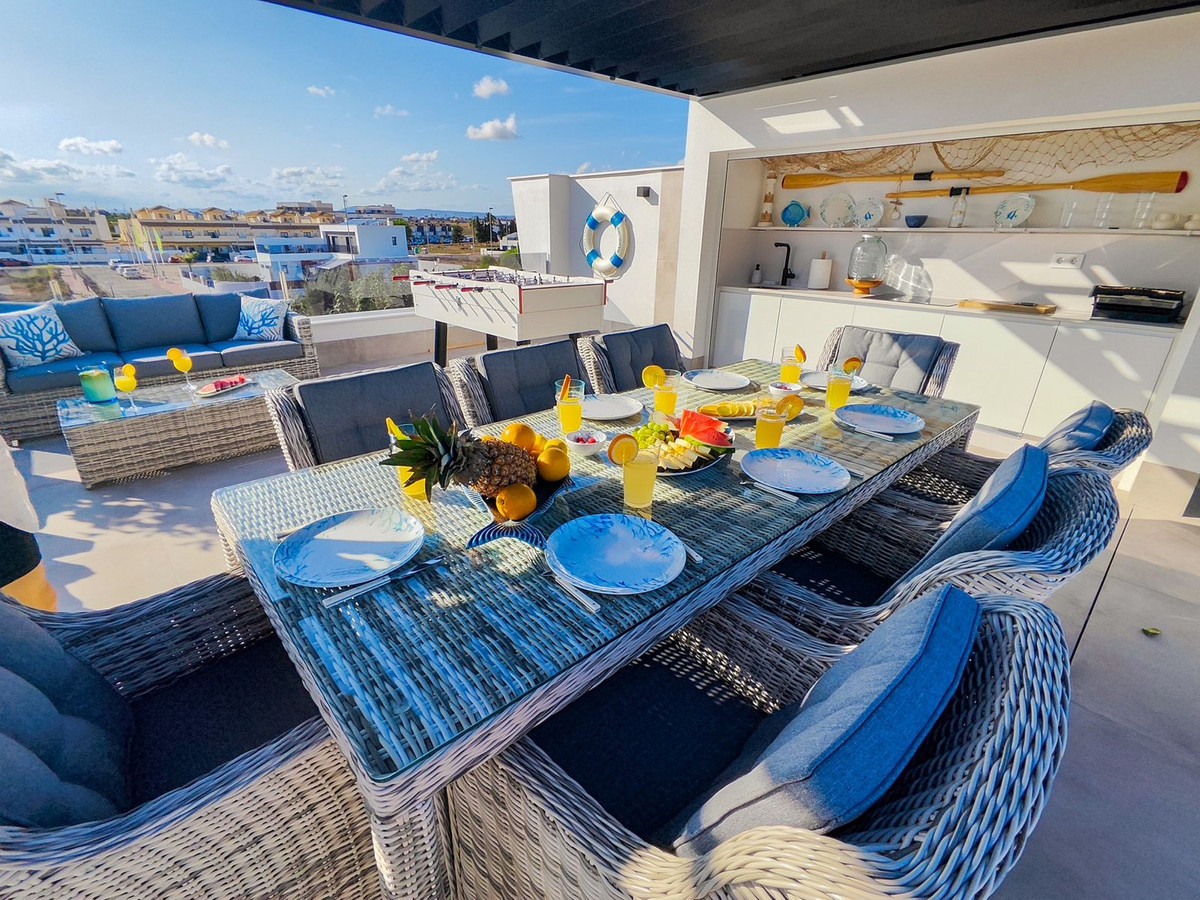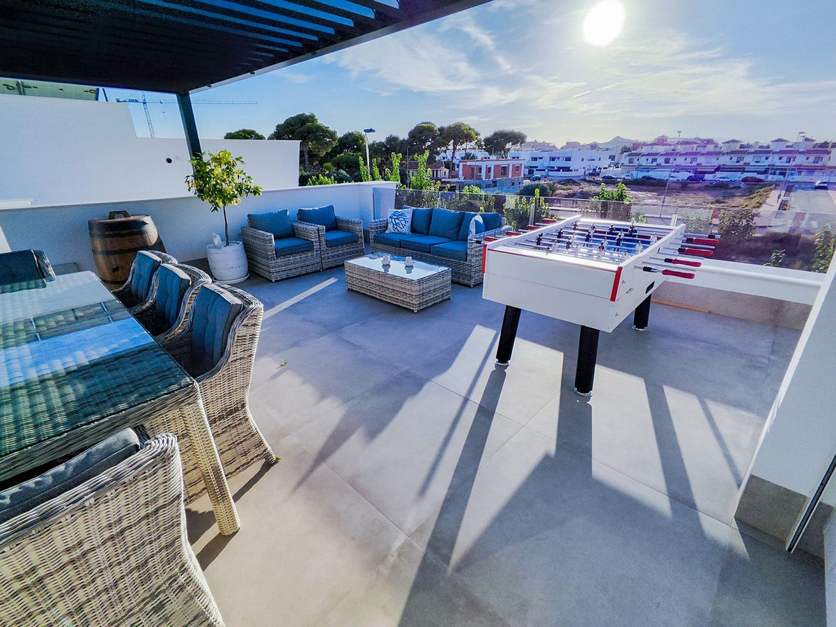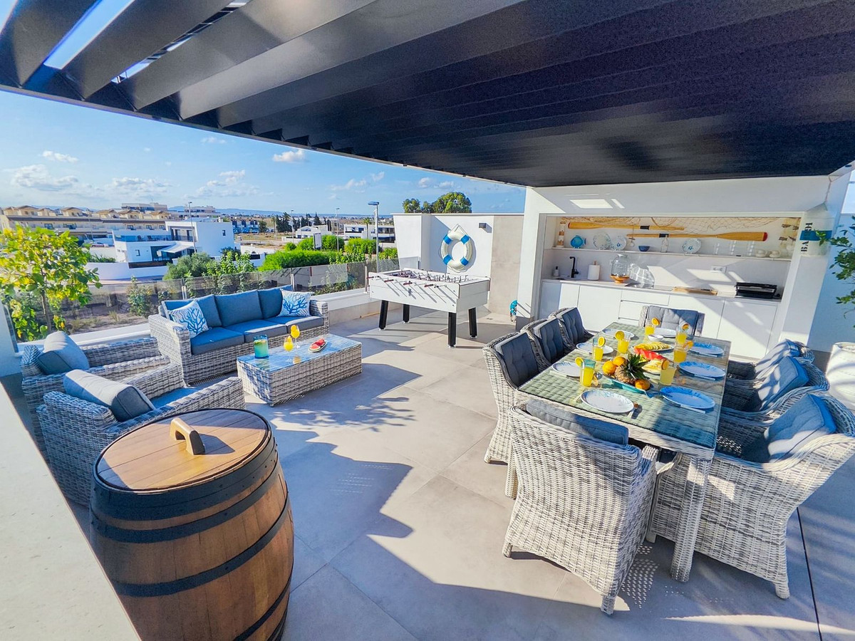 This villa offers everything you could desire and more, featuring three bedrooms with fitted wardrobes and private terraces, three bathrooms with underfloor heating, a spacious living/dining area, and a fully fitted kitchen. The property is bathed in natural light, with sliding patio doors providing direct access to private gardens, terraced areas, and a private swimming pool. Additional benefits include a garage, utility area, electric blinds, a roof solarium with a pergola, an outdoor kitchen, and a smart lock system with a fingerprint sensor.