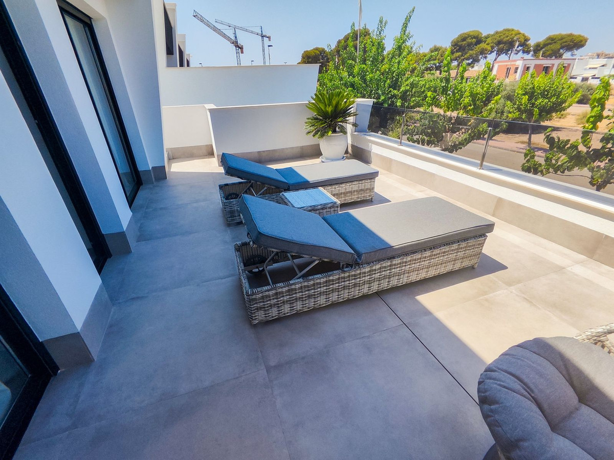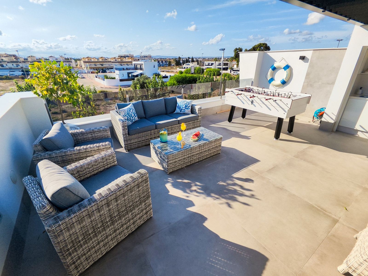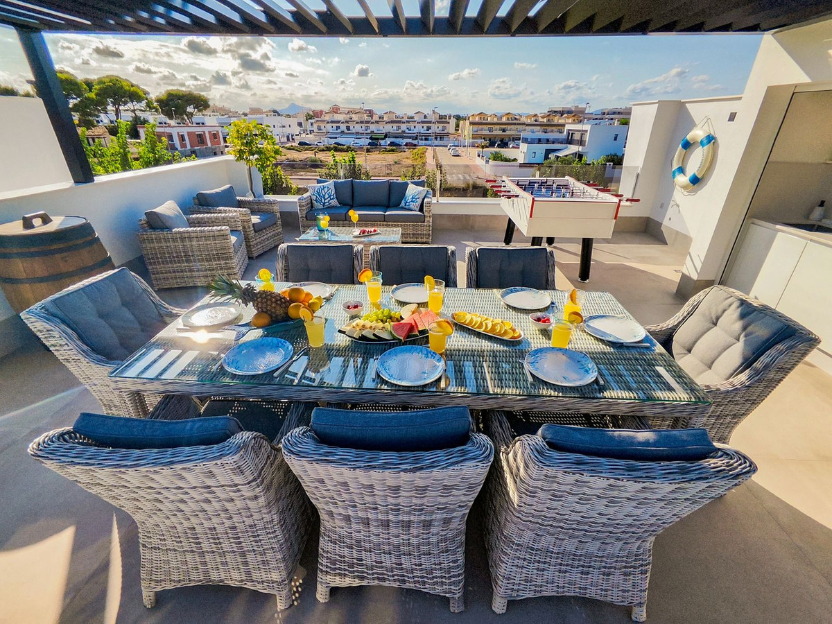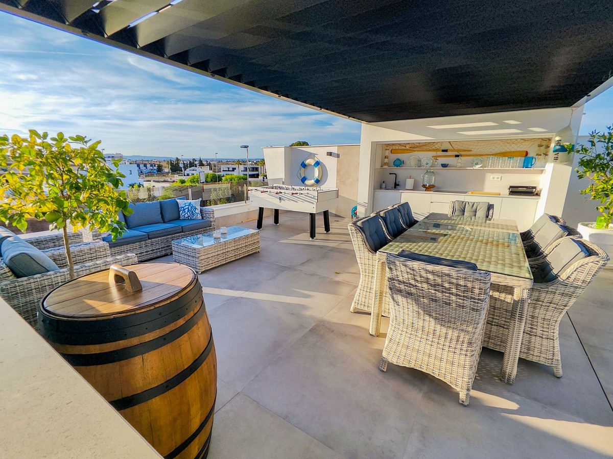This villa offers everything you could desire and more, featuring three bedrooms with fitted wardrobes and private terraces, three bathrooms with underfloor heating, a spacious living/dining area, and a fully fitted kitchen. The property is bathed in natural light, with sliding patio doors providing direct access to private gardens, terraced areas, and a private swimming pool. Additional benefits include a garage, utility area, electric blinds, a roof solarium with a pergola, an outdoor kitchen, and a smart lock system with a fingerprint sensor.