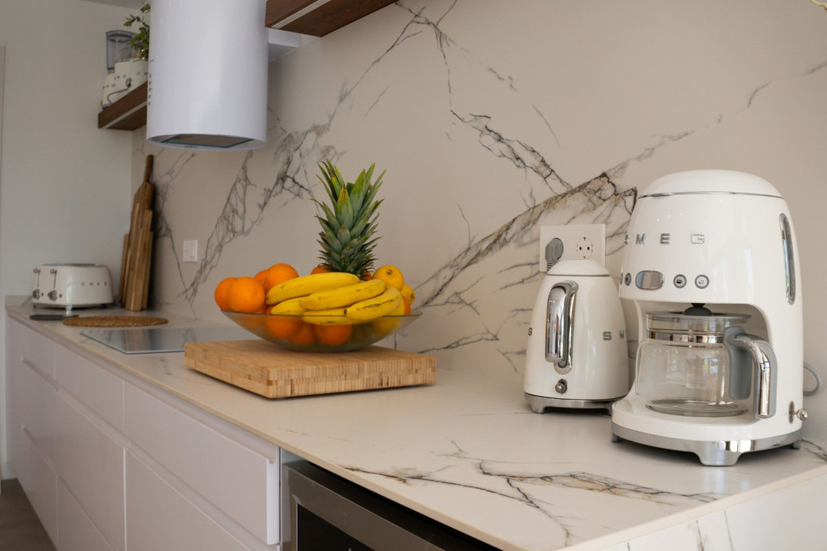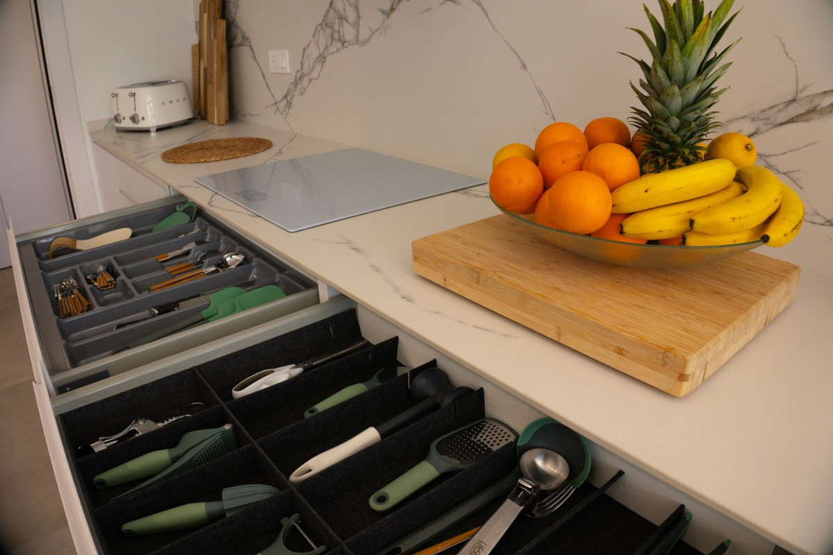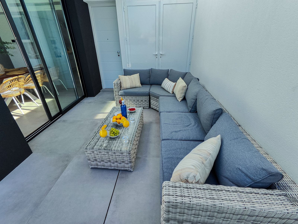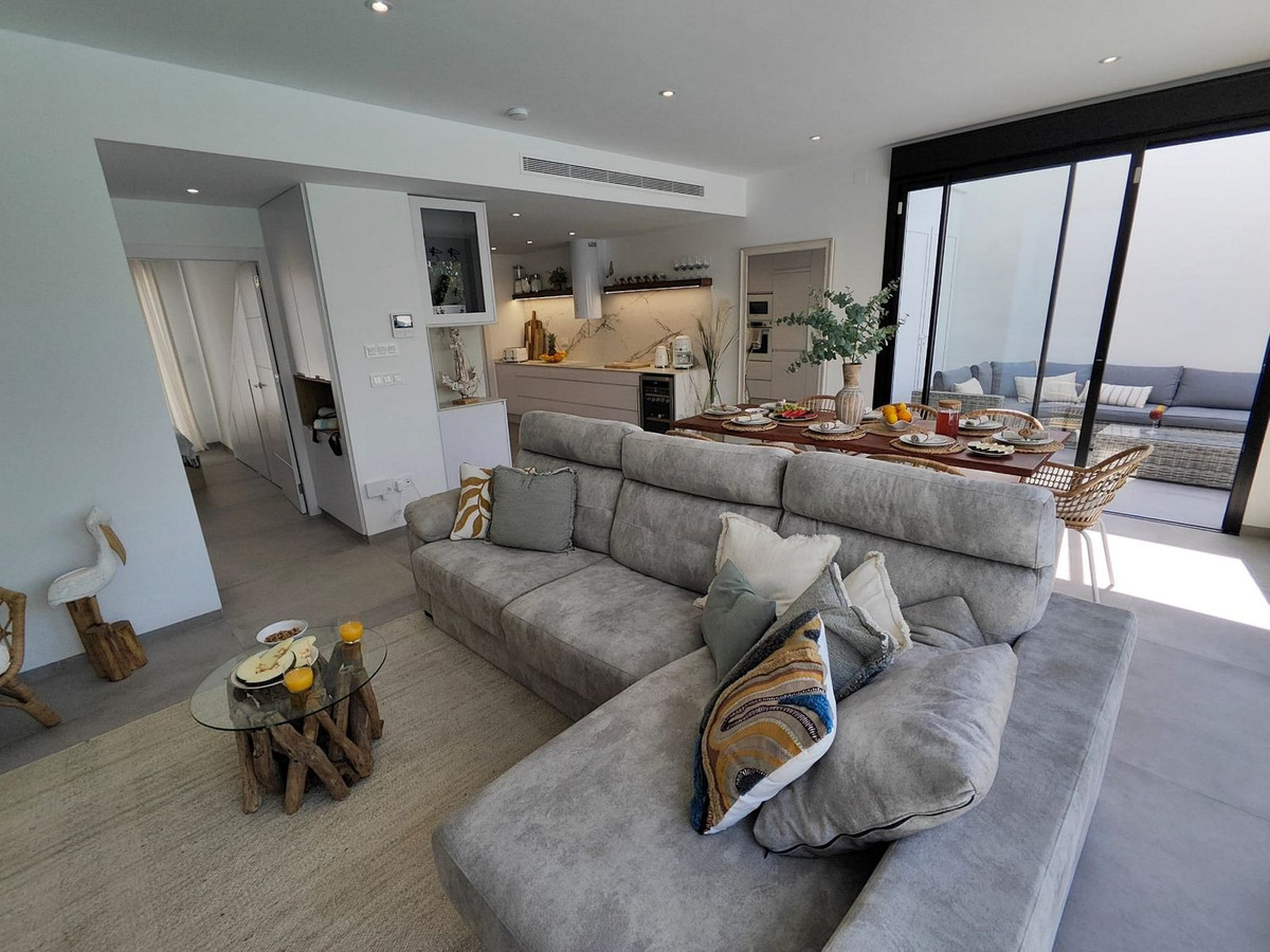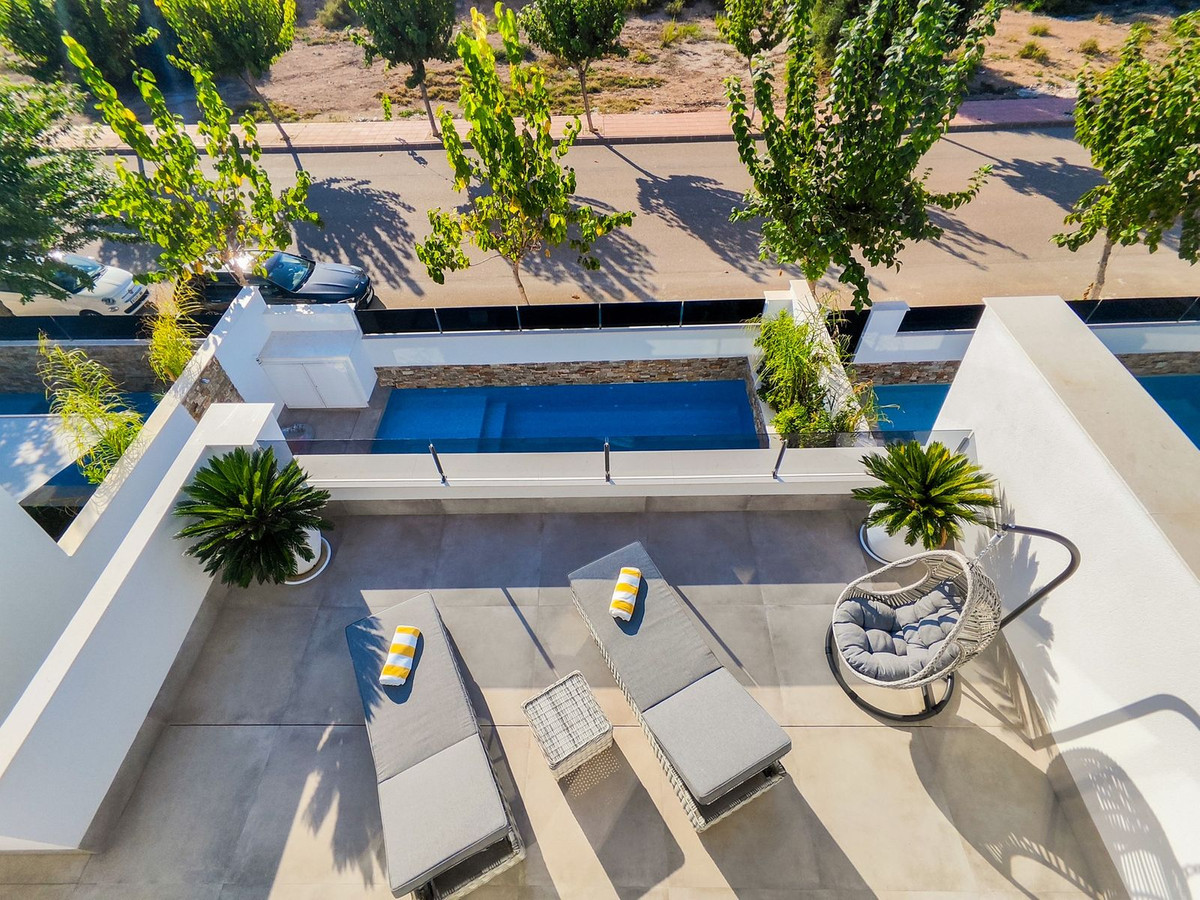 This villa offers everything you could desire and more, featuring three bedrooms with fitted wardrobes and private terraces, three bathrooms with underfloor heating, a spacious living/dining area, and a fully fitted kitchen. The property is bathed in natural light, with sliding patio doors providing direct access to private gardens, terraced areas, and a private swimming pool. Additional benefits include a garage, utility area, electric blinds, a roof solarium with a pergola, an outdoor kitchen, and a smart lock system with a fingerprint sensor.