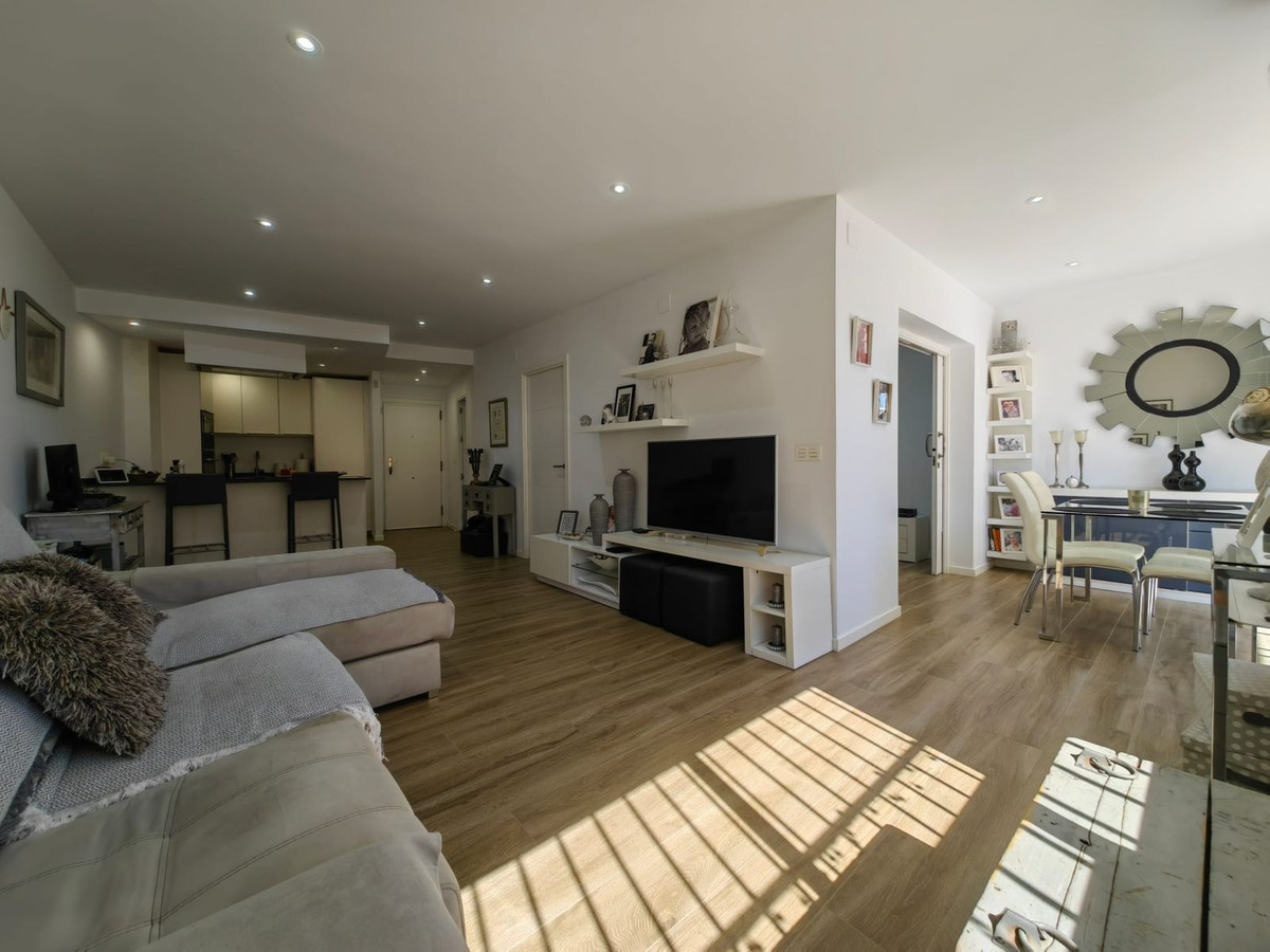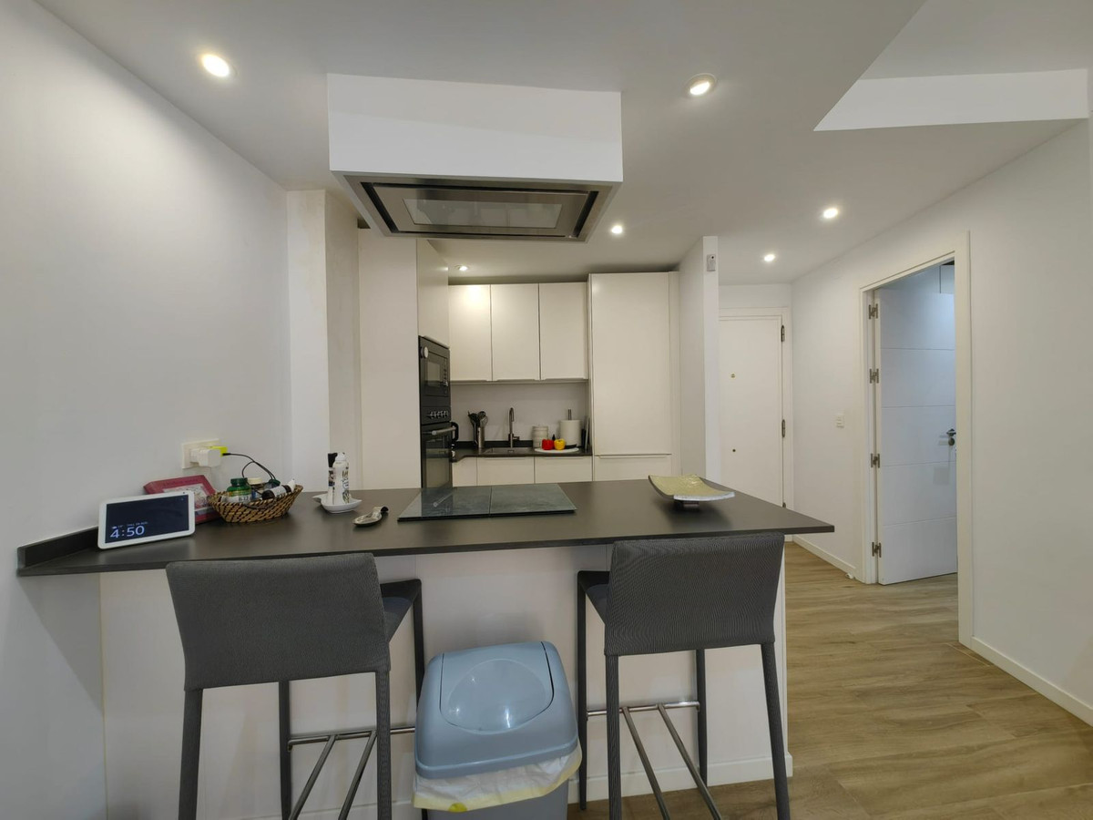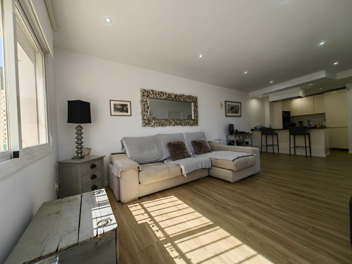 The apartment features a stylish open-plan kitchen with a breakfast counter, flowing seamlessly into the bright lounge and dining area. From here, large glass doors open onto an impressive 45 m² private terrace, perfect for outdoor living, with a lounge area, sunbeds, and views of the surrounding greenery.