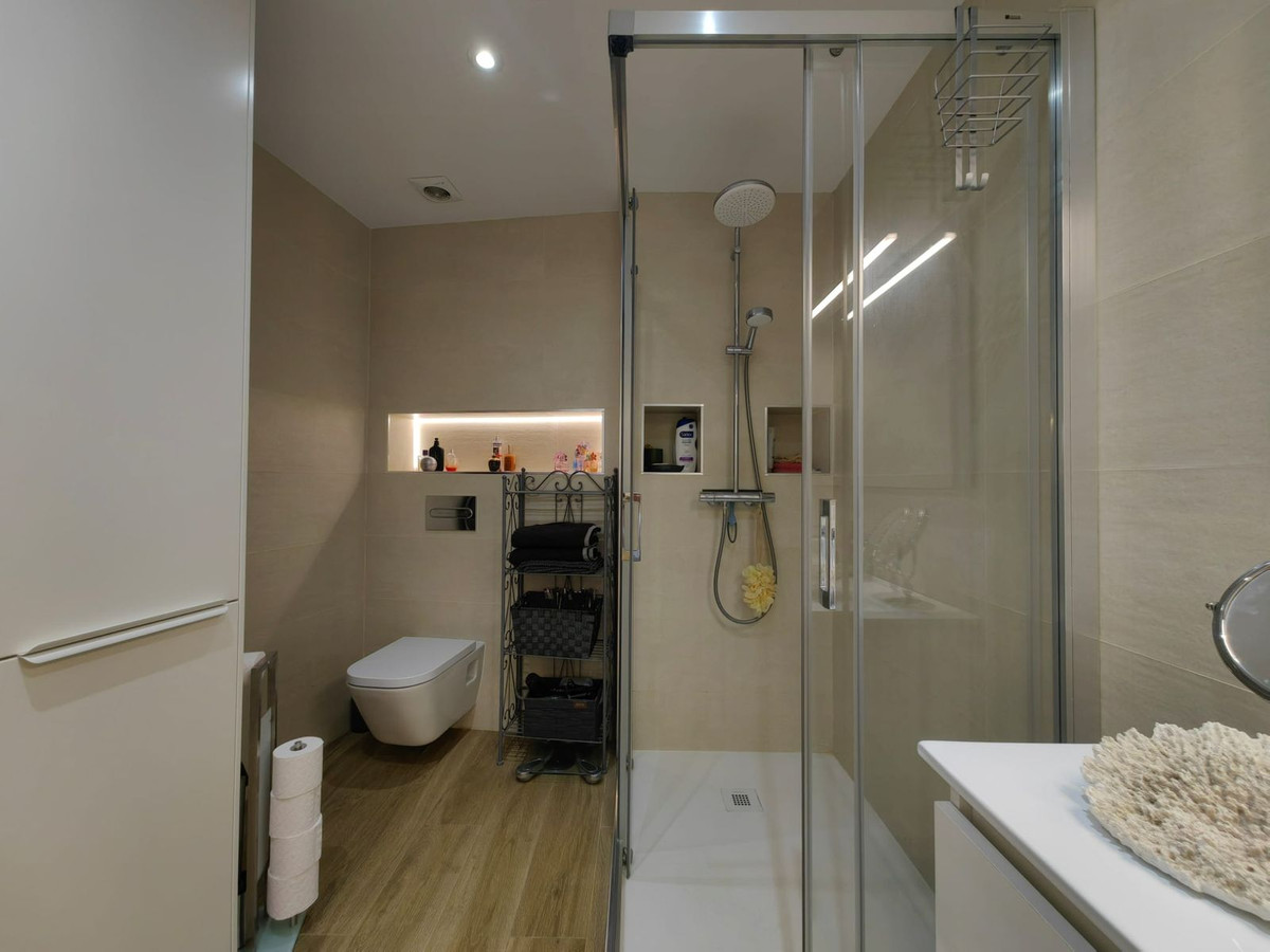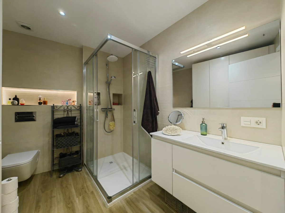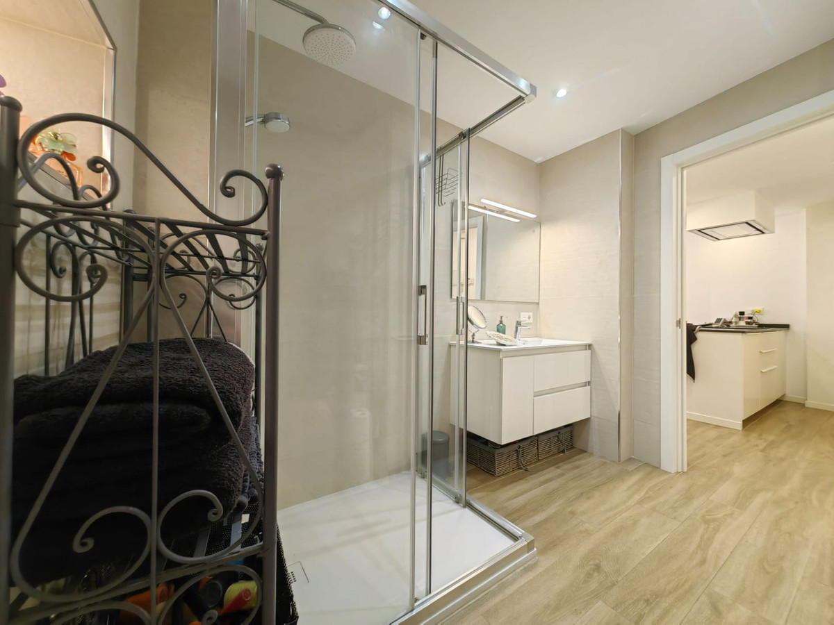 The bedroom is complemented by a modern bathroom with a walk-in shower with glass sliding doors and a wall-mounted toilet. Every detail has been carefully renovated to the highest contemporary standards, including a fully fitted kitchen with quality appliances.