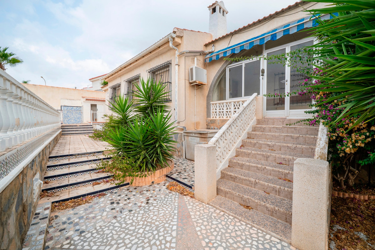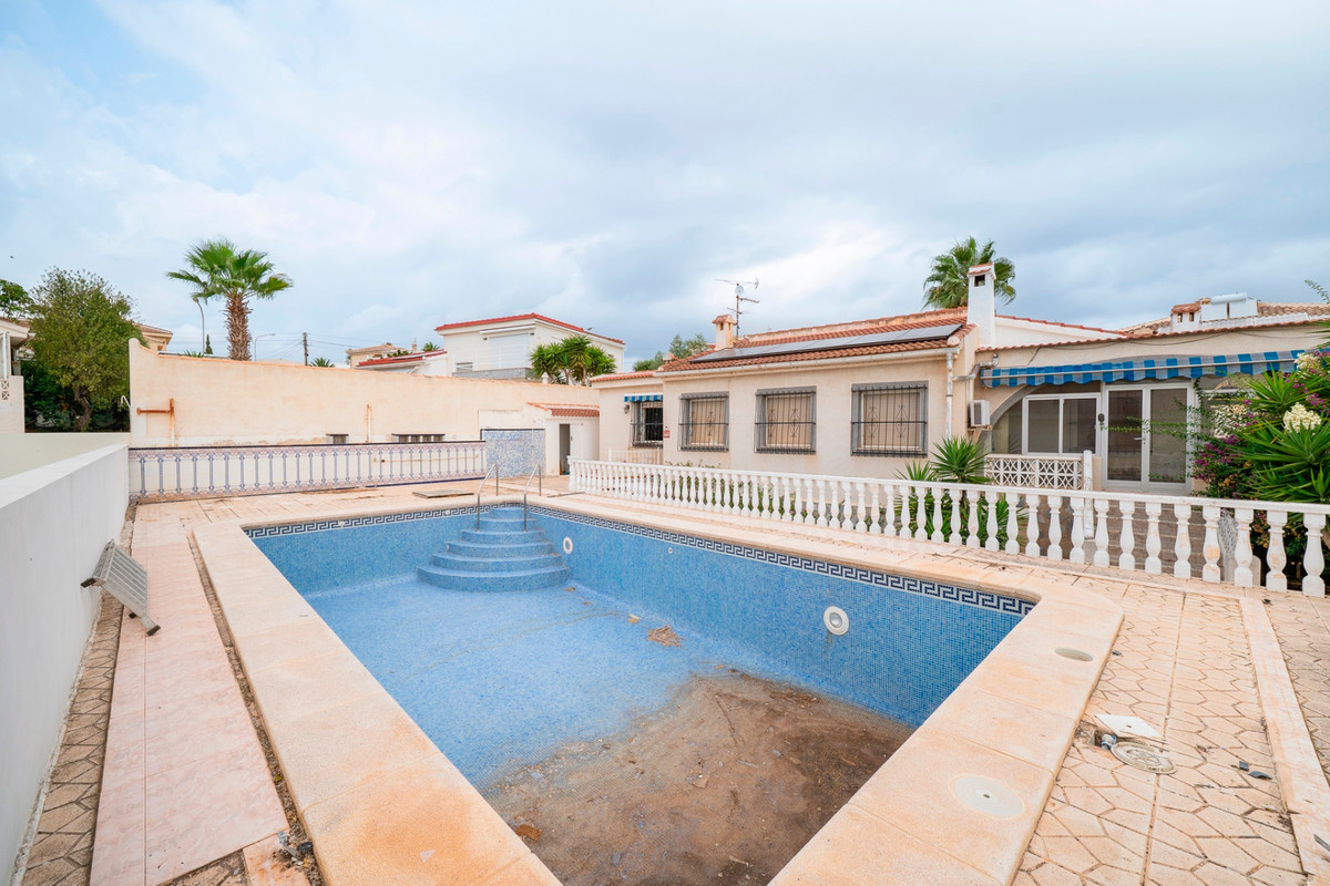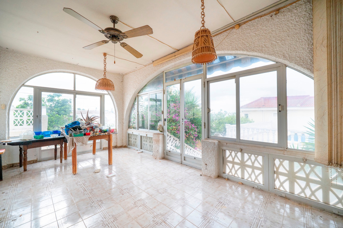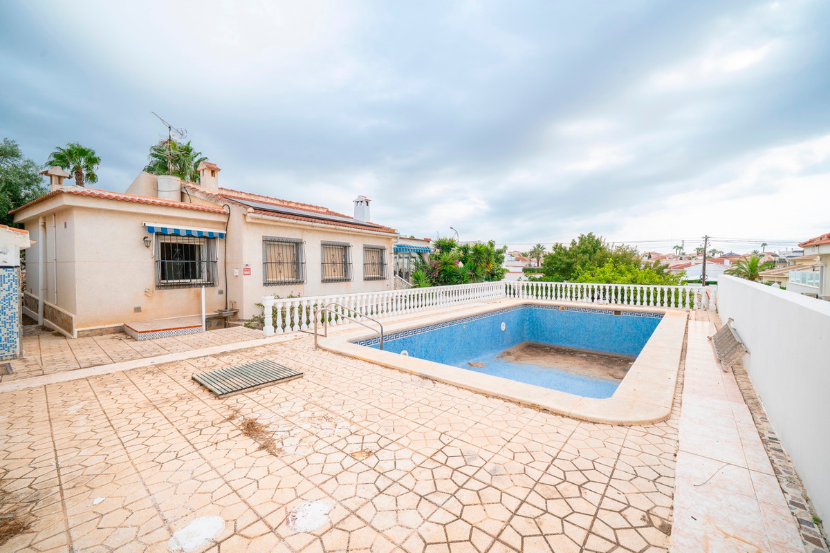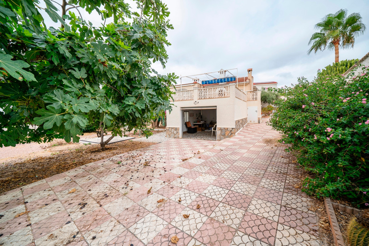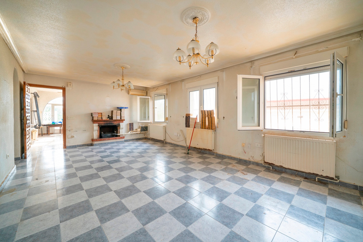 Detached villa built in 1983 with a living area of 92 m², set on a generous plot of 900 m². The property offers two bedrooms and one bathroom, a living room with fireplace, an independent kitchen, and a glazed terrace facing south, which leads via stairs down to the pool area. From the north façade, there is an entrance to a hallway that connects directly to the kitchen.