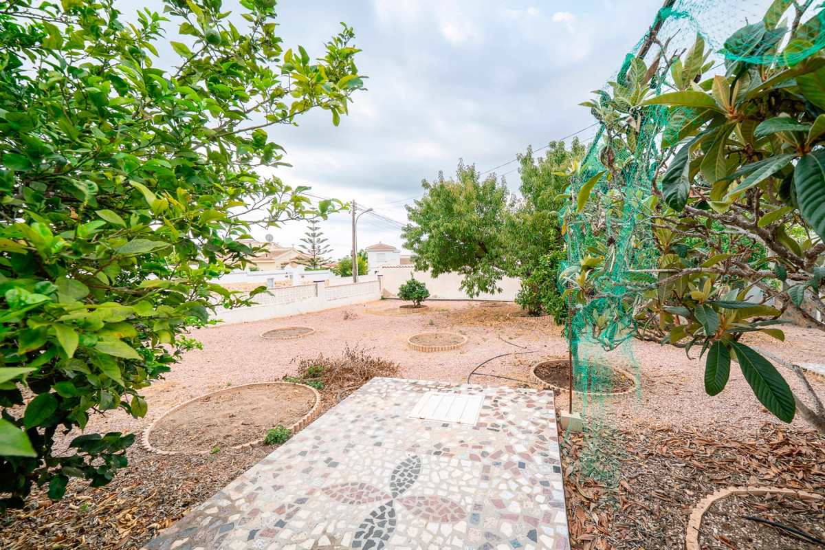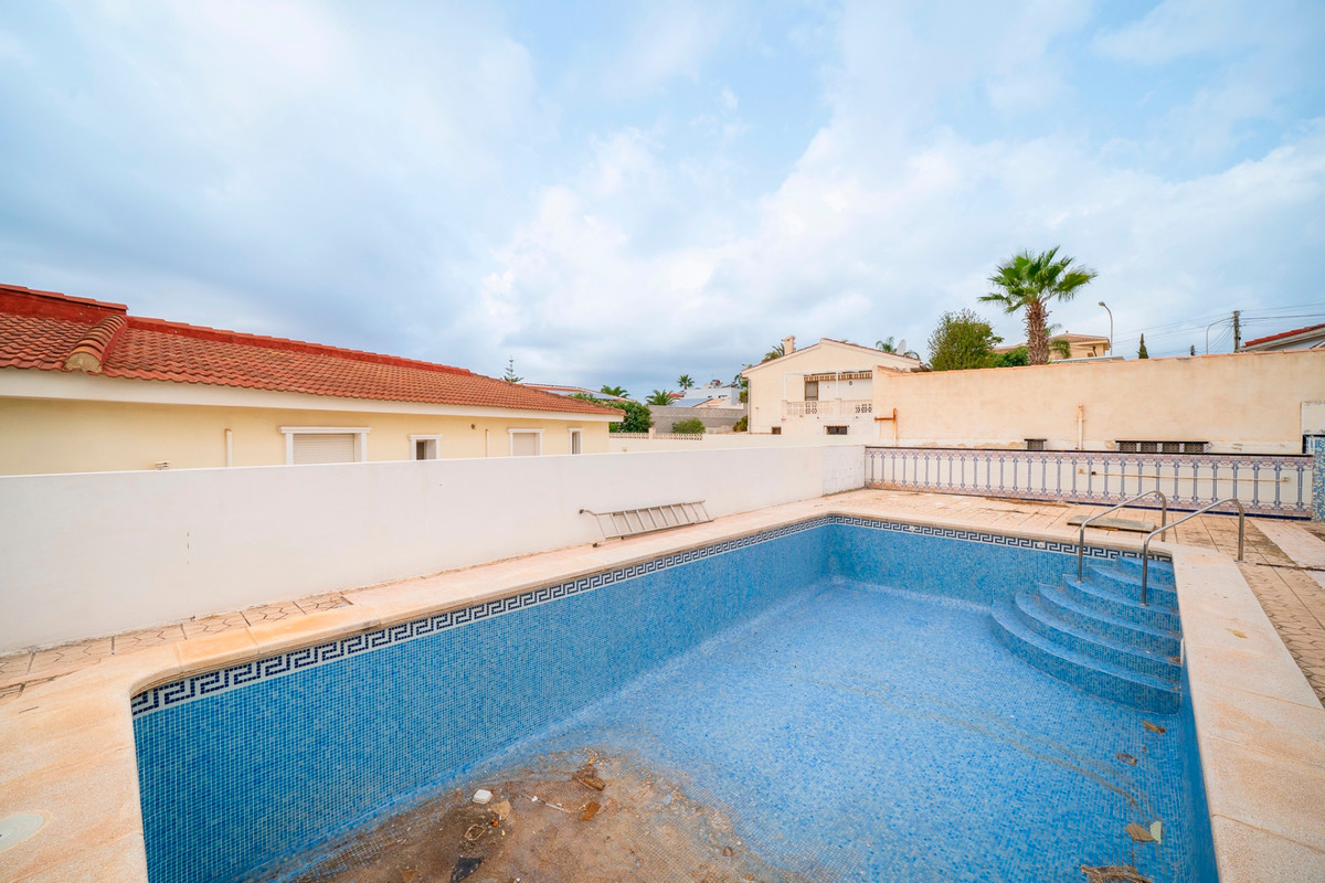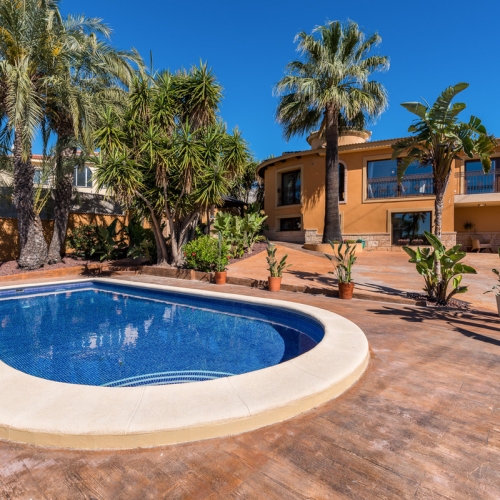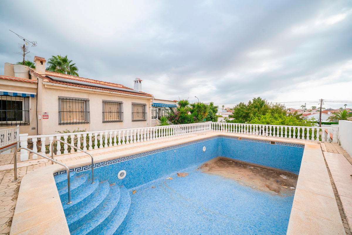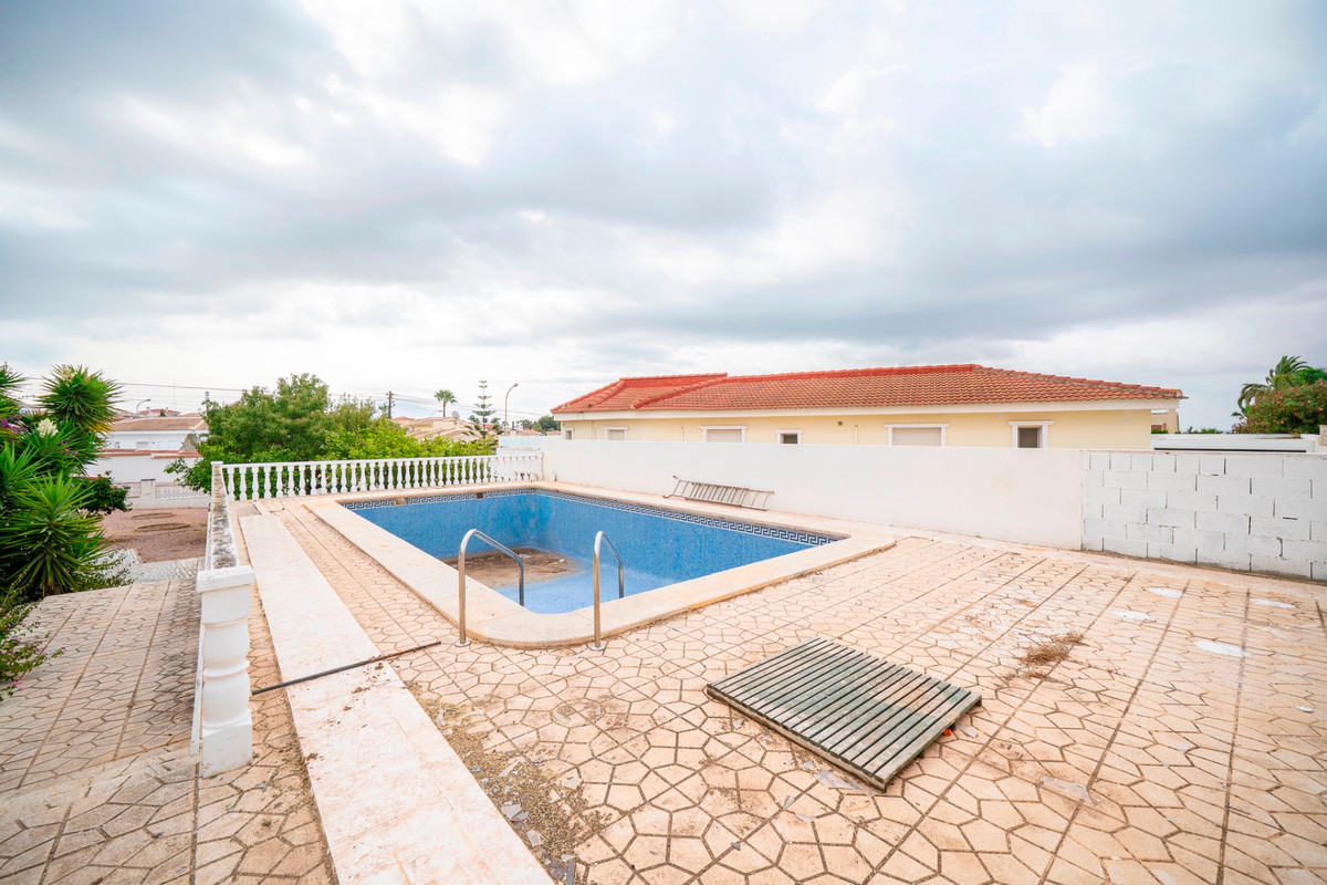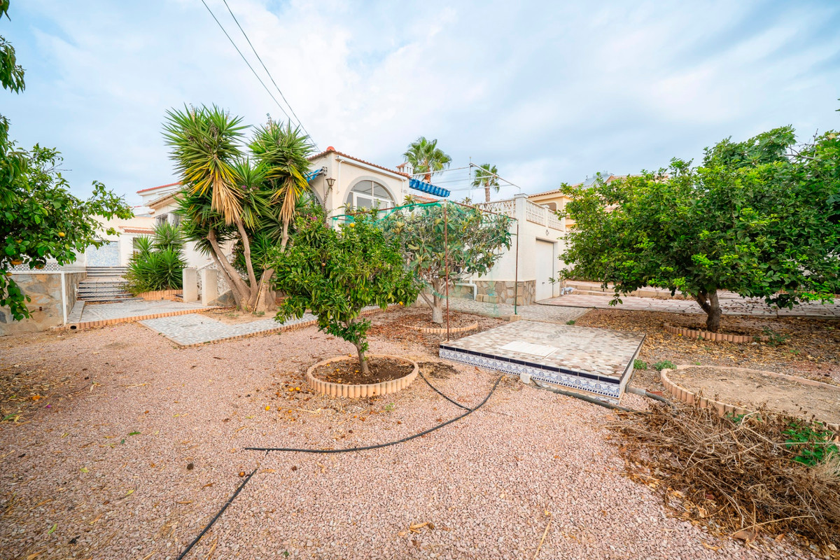 Detached villa built in 1983 with a living area of 92 m², set on a generous plot of 900 m². The property offers two bedrooms and one bathroom, a living room with fireplace, an independent kitchen, and a glazed terrace facing south, which leads via stairs down to the pool area. From the north façade, there is an entrance to a hallway that connects directly to the kitchen.