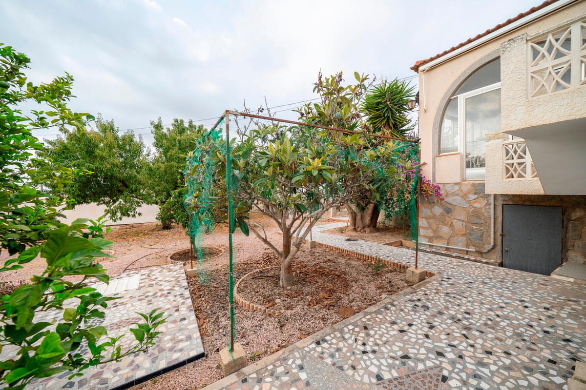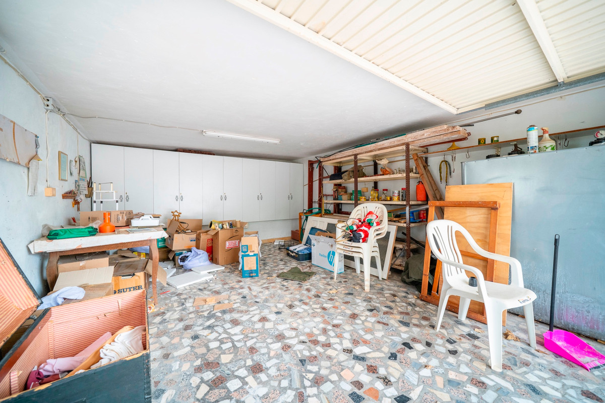 Outside, there is a large garden with mature trees and space for a vegetable garden, as well as an open terrace facing east, accessed by exterior stairs—ideal for enjoying the morning sun. The pool area includes an outdoor shower and a storage space, providing privacy and plenty of room for outdoor leisure. The plot also has a garage and private parking within the grounds.