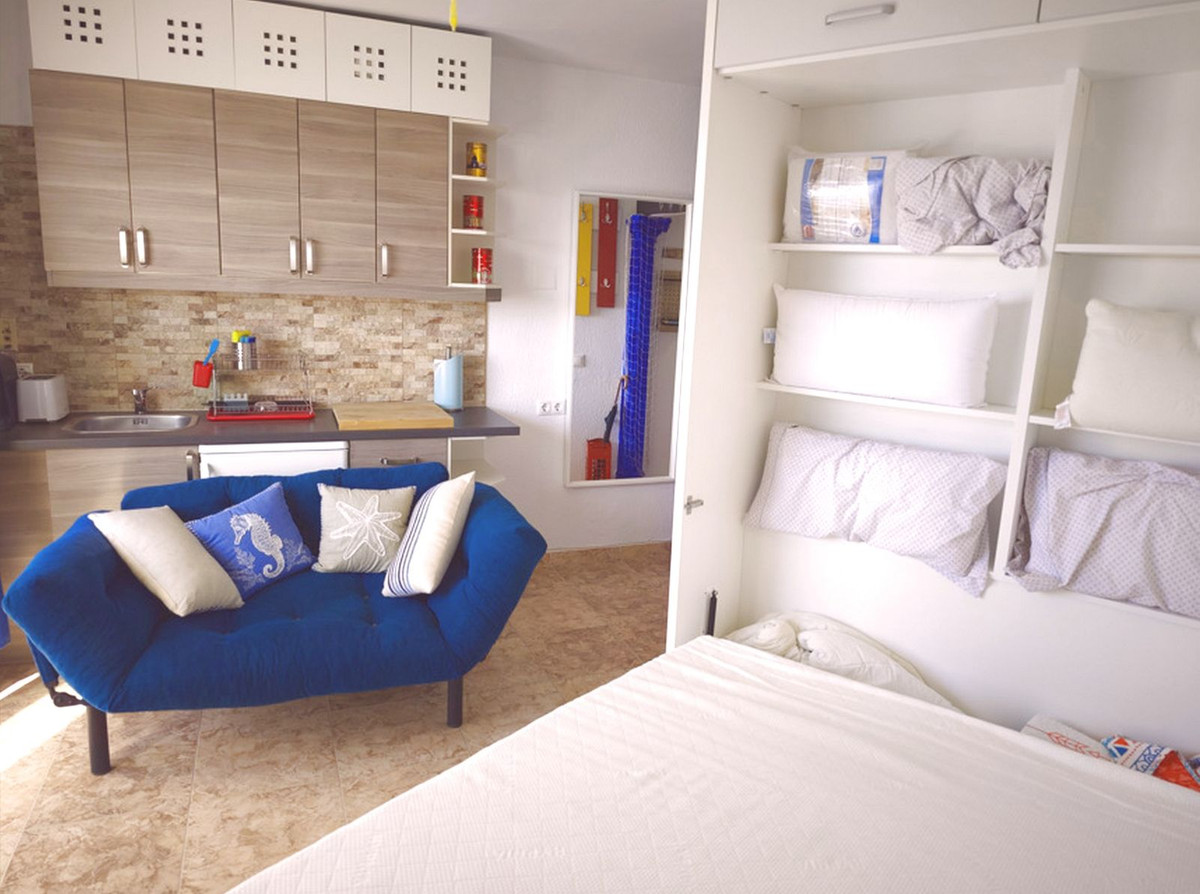 The space includes a cozy living room with an integrated kitchen and a convertible bed that discreetly hides inside the wardrobe to maximize the usable area.