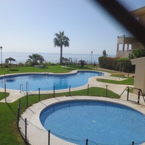 The property features 2 bedrooms with built-in wardrobes, 1 full bathroom, centralized air conditioning and ceiling fan-lights in the bedrooms. Bright living room with access to a terrace, perfect for enjoying the surroundings and the Costa del Sol climate. The apartment also includes access to a communal parking area for added convenience.