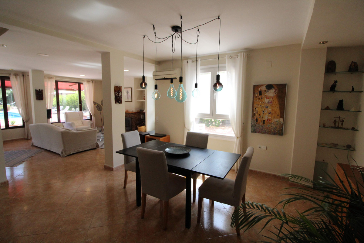 The property itself is of fairly modern design with a good quality build and architectural design of a traditional Finca of the area. The interior has a contemporary layout which flows nicely from the entrance on the main terrace you walk into the lounge with log burner insert in the fireplace and air conditioning, enough comfortable seating for a large family and then further back closer to the kitchen is the dining area. The kitchen is separate and includes all appliances and a utility room with a door leading out to the terrace. On this floor down the hallway there are 2 double bedrooms and a bathroom with shower/tub. The stairs leading upstairs from the lounge lead to 4 more bedrooms including the master bedroom and another family bathroom with walk in shower. From the master there is access to a large solarium overlooking the garden. One of the bedrooms is set up as a small gym but can also be used as an office.  All bedroom have AC units and built in wardrobes.