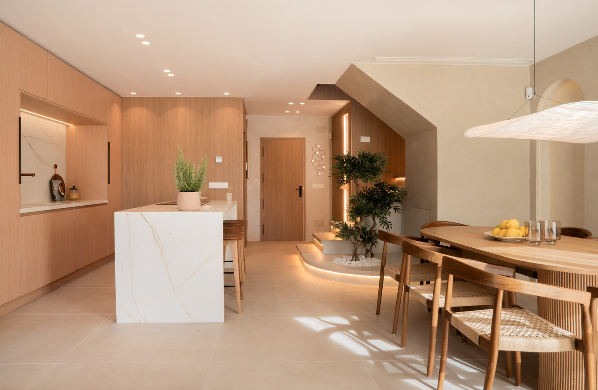 This exceptional home features four bedrooms, one en-suite bathroom, an additional full bathroom, and a guest toilet, offering generous space for family and guests. The renovation is of the highest quality, with exquisite microcement finishes, hidden LED lighting creating a cosy ambiance, and bespoke, custom-made carpentry throughout, giving the home an unmistakable sense of luxury and sophistication.
