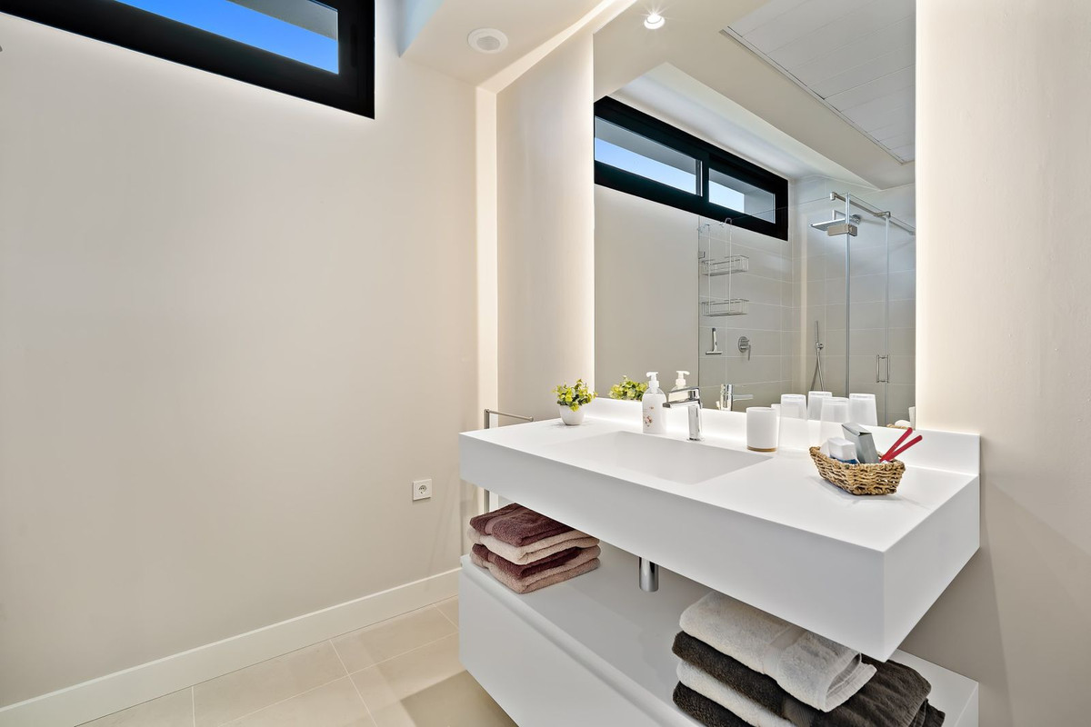 On the ground floor, you will find a spacious lounge with a cosy dining area alongside with direct access to the terrace. The dining area is connected to the open kitchen which offers the laundry room and separate toilet behind it. On the first floor you have 2 beautifully decorated spacious bedrooms en suite with access to the first-floor terrace and panoramic sea views. On the min 1 there are 2 more spacious bedrooms with a shared bathroom.