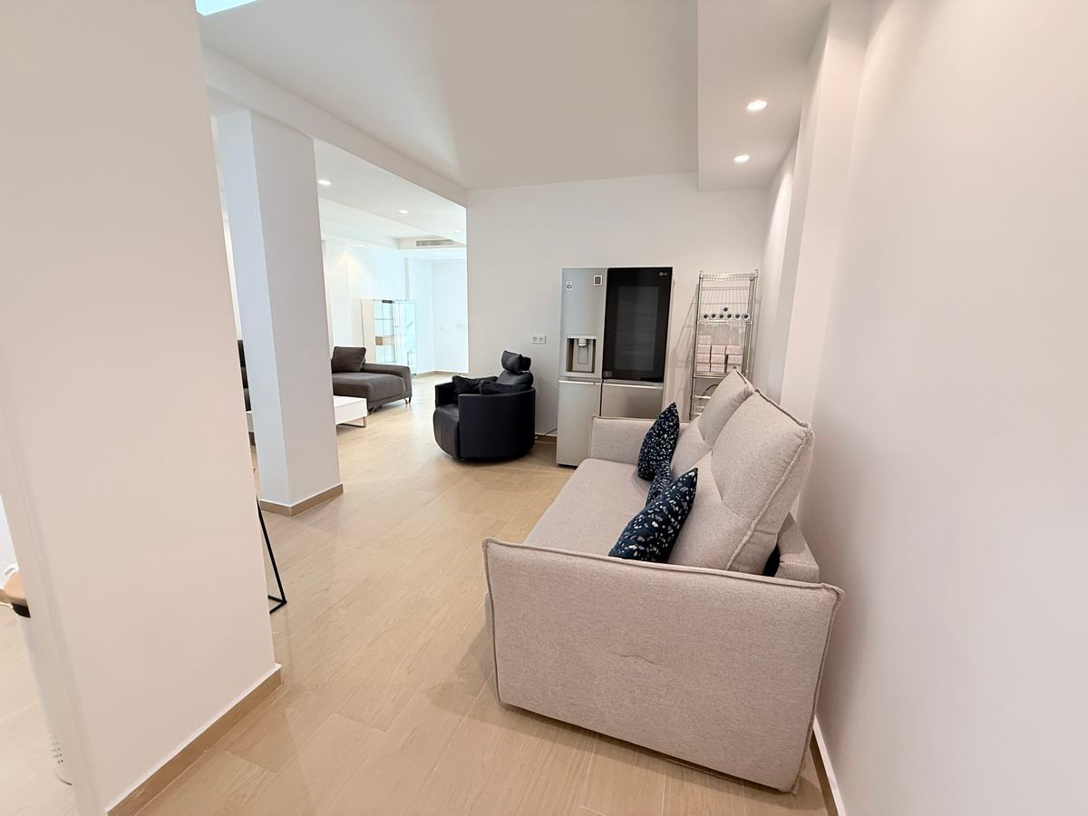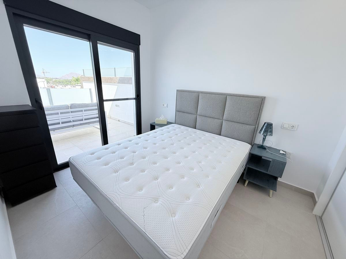 The ground floor features a spacious open-plan living and dining area, a contemporary fully fitted kitchen, and large patio doors that open directly to a private swimming pool with cascade feature and a sunbathing area – the perfect spot to relax and enjoy the Spanish sunshine. This level also includes one double bedroom with fitted wardrobes and a modern bathroom with a walk-in shower.