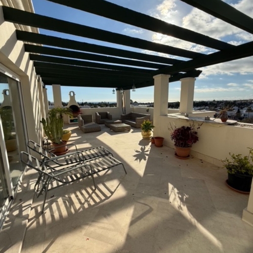 This contemporary fully refurbished penthouse is located in the sought-after area of La Dama de Noche, Nueva Andalucia, walking distance to Puerto Banus and the beaches. Offering 3 bedrooms and 2 bathrooms, the property is ideally situated close to a range of amenities, including shops, schools, transport links, the beach, golf courses, and the town centre. The penthouse is set within a gated community, featuring a doorman and surveillance cameras, ensuring a secure and peaceful environment.