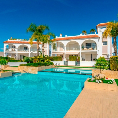 This South West Facing, Two Bedroom, Top Floor Corner Apartment in Doña Pepa is located within a highly sought-after, impeccably maintained gated residential, holiday & exclusive complex called Residencial Albamar. Just a 5–10 minute walk to bars and restaurants, with main chain supermarkets and a JYSK furniture store around 15 minutes walk away. The La Marquesa Golf Course in Rojales, plus the towns of Benijofar and Quesada, can be reached in 5–10 minutes by car, while the beautiful beaches are only a 10-minute drive. Occupying a desirable corner position, this immaculately presented apartment of 76m2 offers a bright, open-plan living area with double sliding glazed doors that open to a spacious terrace.  There is a fitted kitchen, two double bedrooms with built-in wardrobes, and a family bathroom. From the terrace, external stairs lead up to an impressive private solarium of approximately 60m², complete with a store room (plumbed for possible use as a utility), built-in work sink area, BBQ, and superb open views towards the salt lake — perfect for enjoying spectacular sunsets. Extras include an underground parking space and air conditioning. The stunning complex boasts three beautifully laid out communal pool areas, a children's pool, decorative built features including water fountain, and various planted areas, palm trees.  Located on the Costa Blanca South, this property combines comfort, style, and a prime position close to all amenities.\n