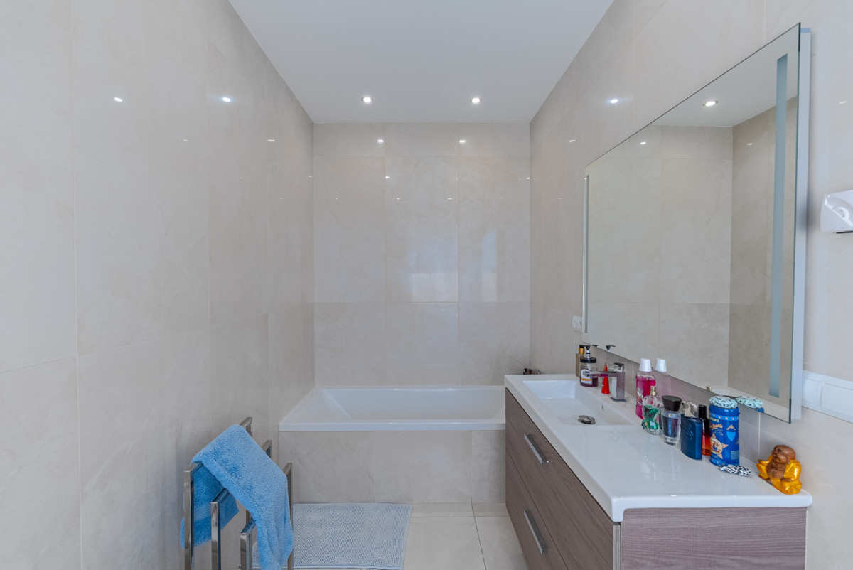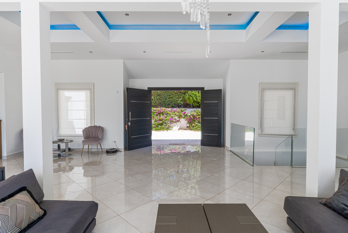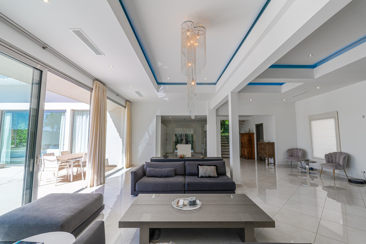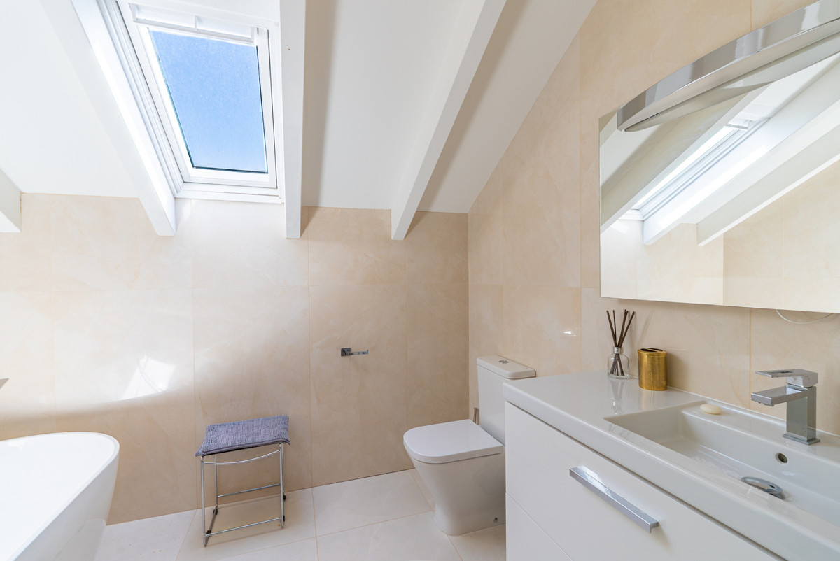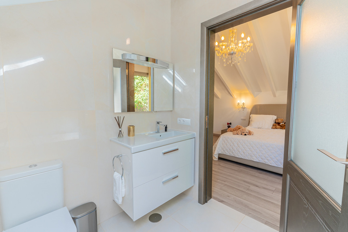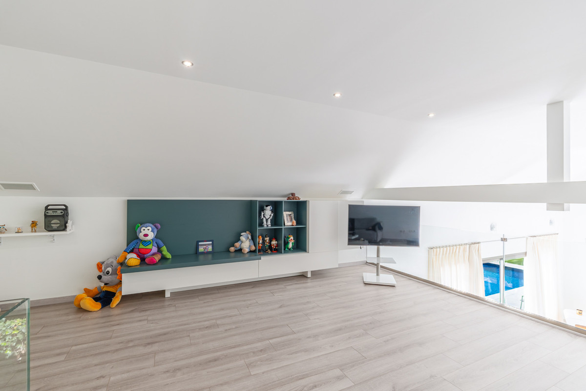 Spread across three levels, the home features five spacious bedrooms, each with its own en-suite bathroom, as well as a separate guest bathroom. The main floor includes a welcoming entrance hall with double-height ceilings, a generous living area with a fireplace, and floor-to-ceiling glass doors that open onto a relaxing chill-out terrace with garden views.