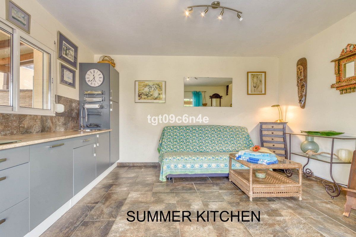 On the lower floor (garden level): independent studio with kitchen and bathroom with shower, for guests or for rental; private terrace-porch with sea view; summer kitchen-dining room with direct access to the swimming pool; covered, independent outdoor dining room; large storage room.