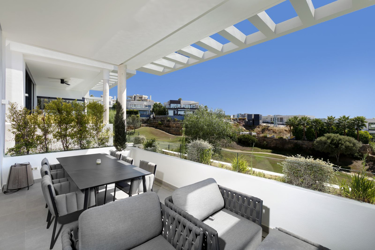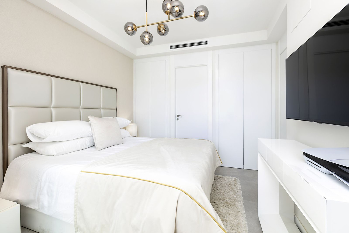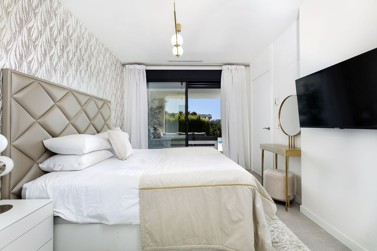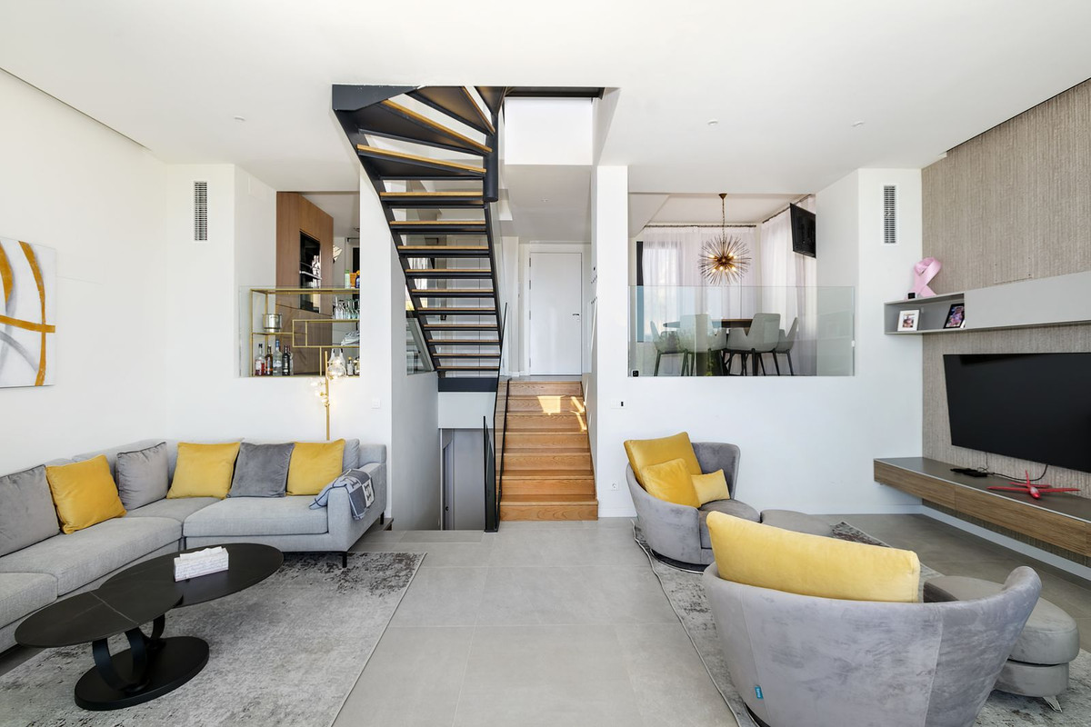 This beautiful open plan property enjoys double height ceilings in the sitting room with panoramic views across the golf and treetops to the stunning blue Mediterranean.