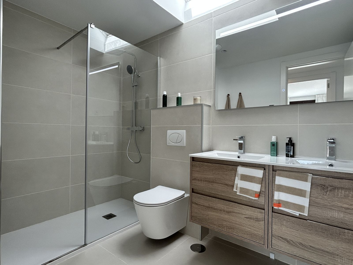 Large-format porcelain flooring extends throughout the home. 2.10 m interior doors, clad built-in wardrobes, and glass railings on the terraces provide elegance and security. The complex emphasizes sustainability with thermal insulation and pre-installation for an electric vehicle charger. Two parking spaces are included, and a storage room is available subject to availability.