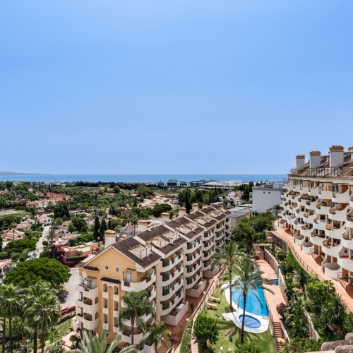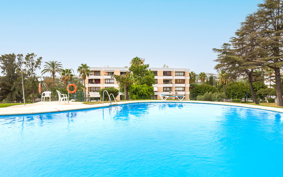 First-floor apartment facing south and east, surrounded by golf courses and amenities, Torres de Aloha, Nueva Andalucía. It consists of a living-dining room, a small kitchen, and an east-facing terrace, as well as a bedroom with an en-suite bathroom. Beautiful gated complex with reception, security guard, swimming pool, and within walking distance to restaurants, cafés, supermarket, tennis club, and golf courses. The monthly community fees include water and electricity supplies. A fantastic holiday home and ideal for investors seeking high rental potential. The development features spectacular gardens and a large swimming pool, surrounded by some of the best golf courses in the area. Very soon, the new promenade connecting Aloha with Puerto Banús will also be inaugurated.