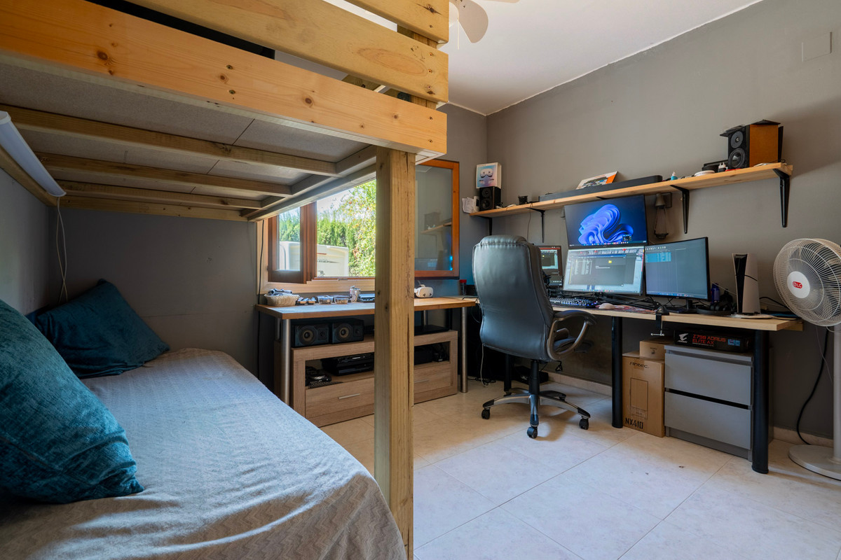 The property is entirely on one level and features a cozy living-dining room with a fireplace and an adjoining semi-open kitchen. There are three double bedrooms in total, one of which has an en-suite bathroom, plus a separate bathroom. Both the living room and the master bedroom have direct access to a spacious covered terrace by the pool, the perfect place to relax and enjoy the Mediterranean climate. A few steps down is a sunny uncovered terrace with a barbecue. The villa also has a low-maintenance Mediterranean garden with palm trees, flowering shrubs, and a pomegranate tree.