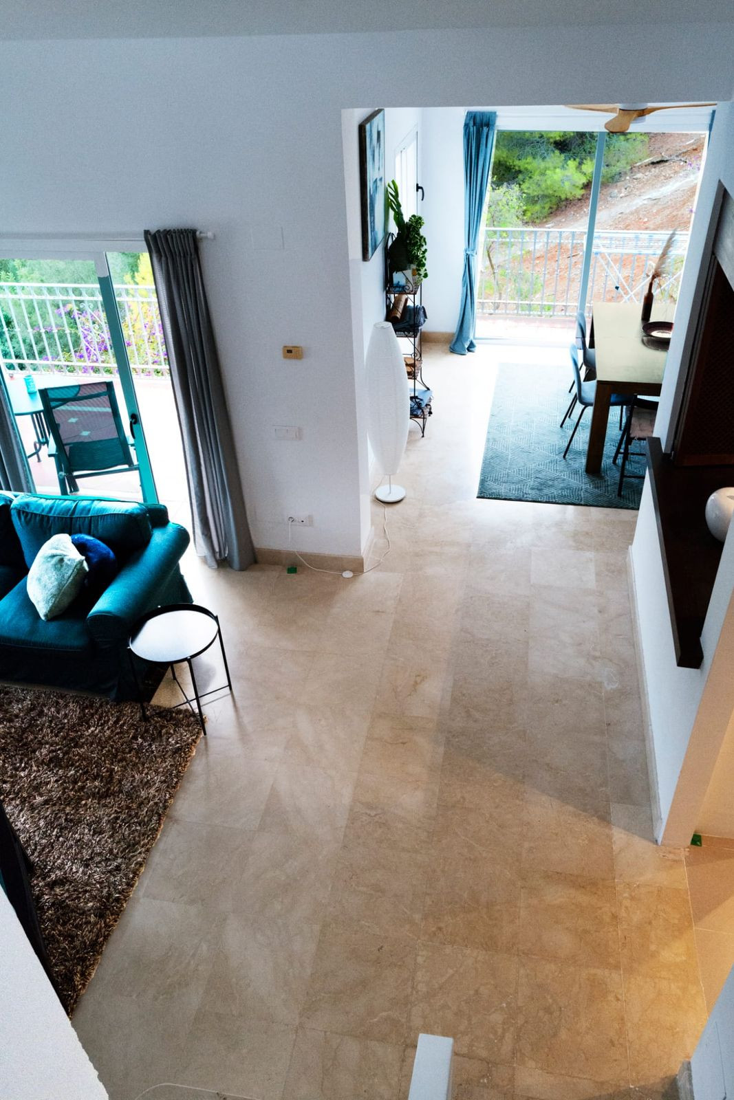 When entering this property you have the guest toilet Through the stairs you enter the spacious living room with separate dining area. With opening the sliding doors you reach the terrace.