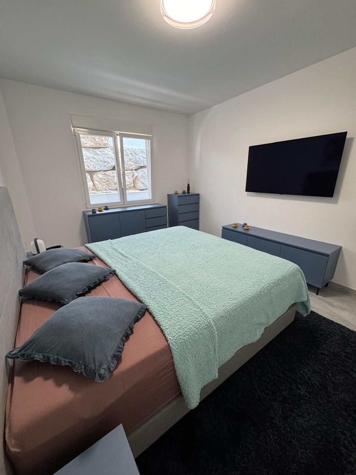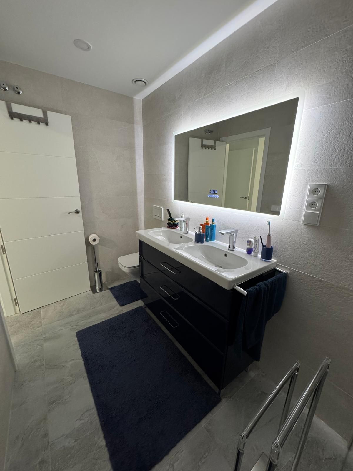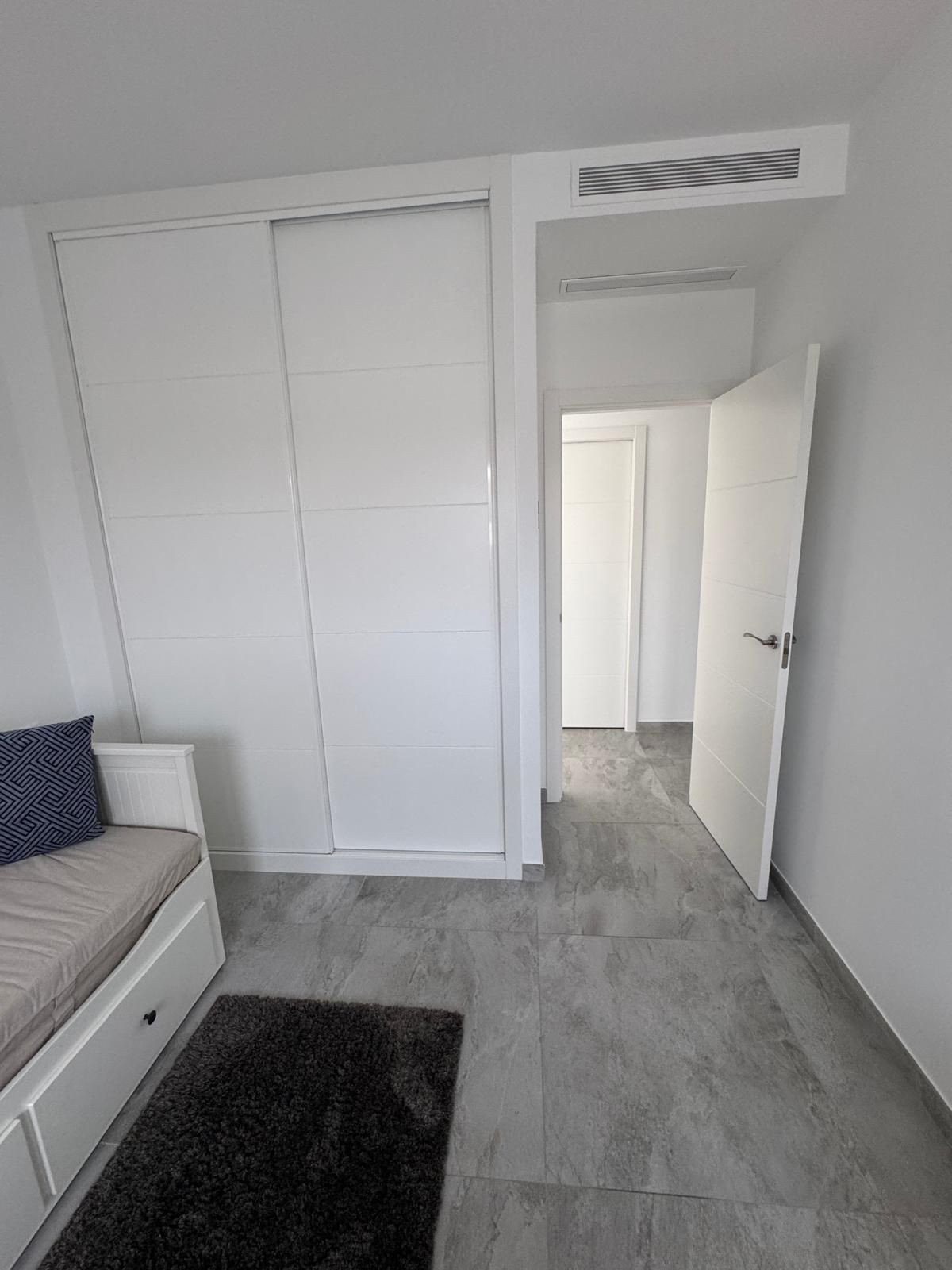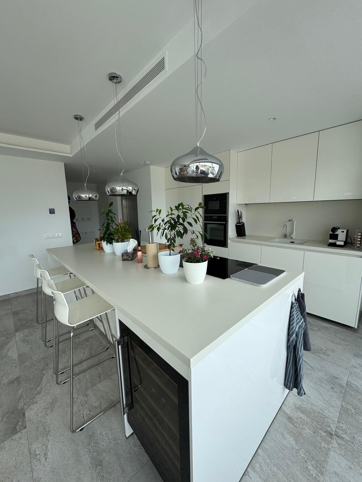 The perfectly designed penthouse offers three spacious bedrooms, all featuring built-in wardrobes and electric blinds on the windows. The main bedroom boasts an en-suite bathroom with double sink and a tiled walk-in shower with a rain shower head. The other two bedrooms share a second bathroom, also with a walk-in shower. In addition, there is a laundry room with additional storage space and a washer/dryer, underfloor heating throughout all the apartment, centralized air conditioning hot/cold, and an additional 2 water filters installed.