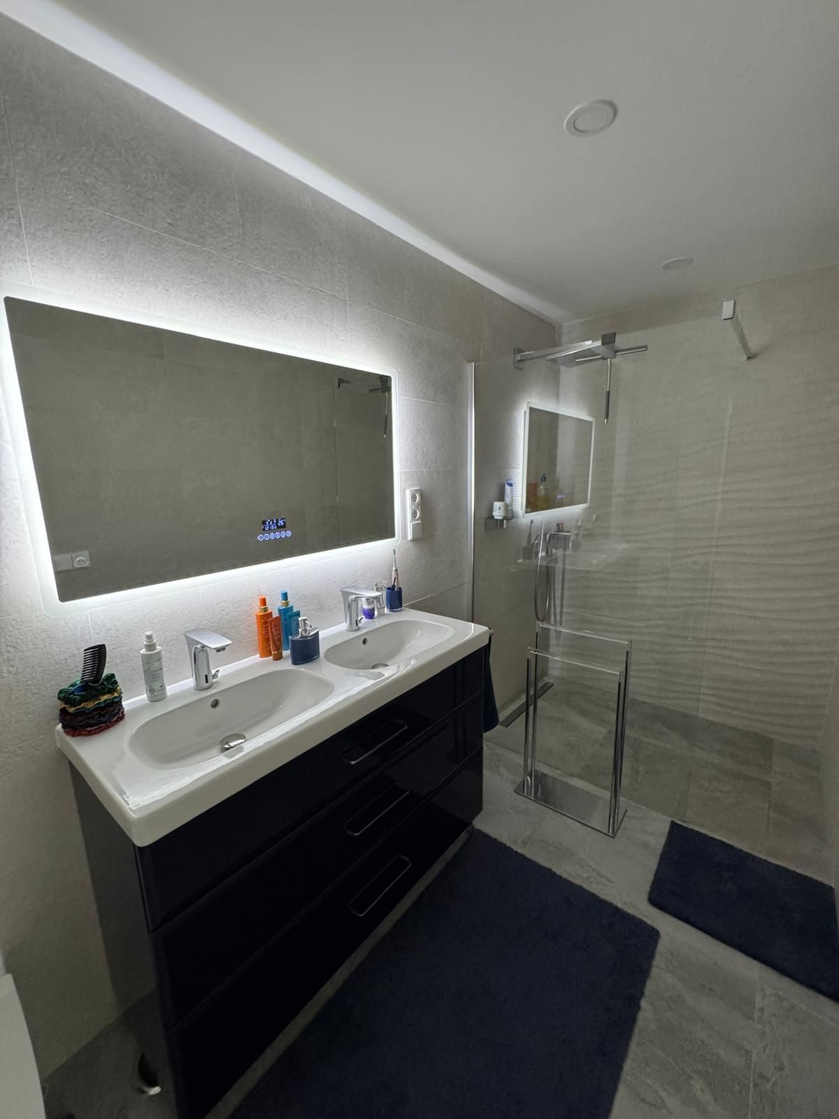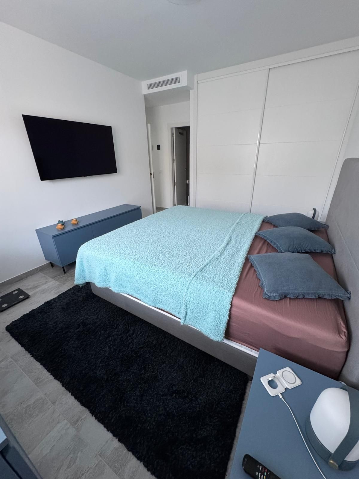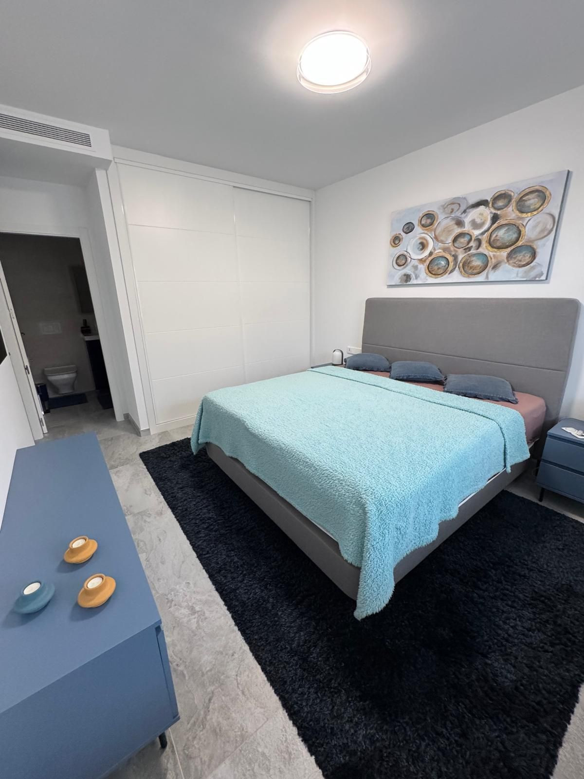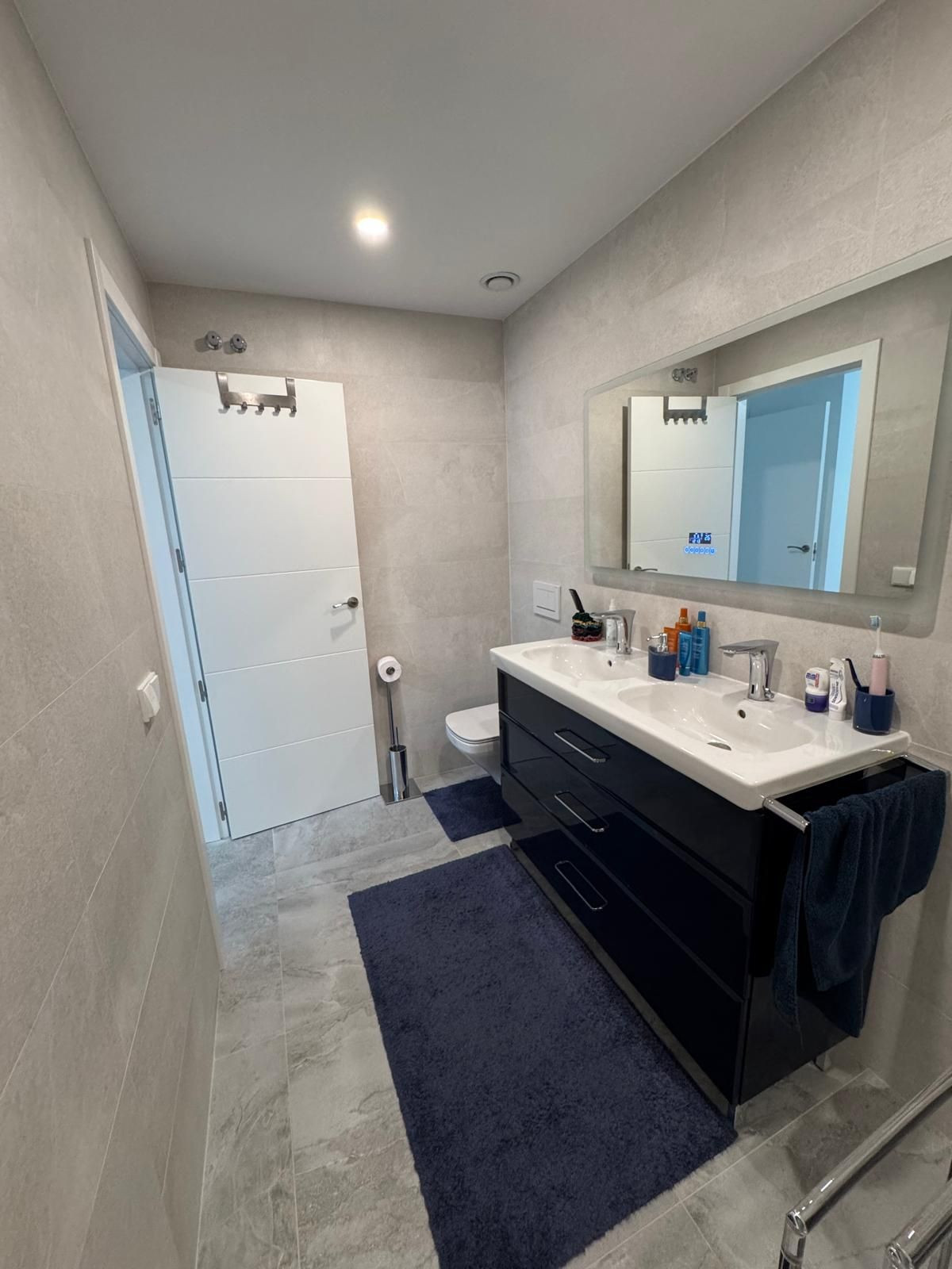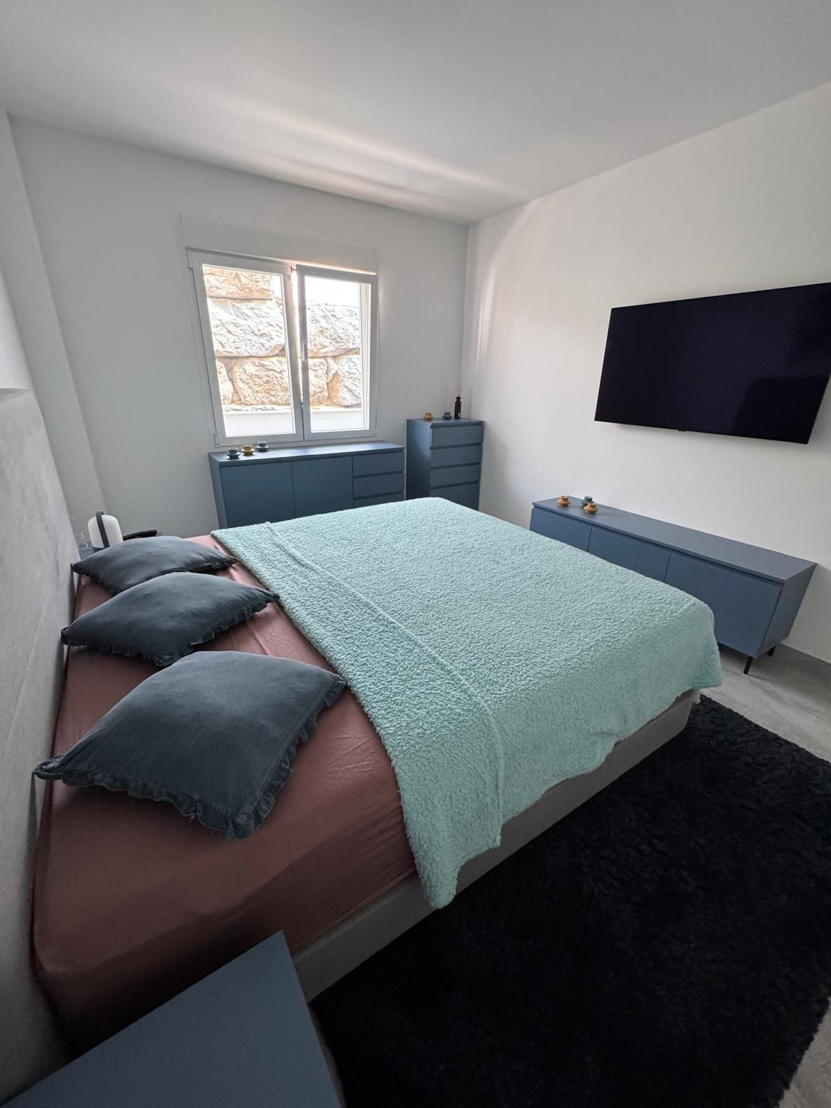The perfectly designed penthouse offers three spacious bedrooms, all featuring built-in wardrobes and electric blinds on the windows. The main bedroom boasts an en-suite bathroom with double sink and a tiled walk-in shower with a rain shower head. The other two bedrooms share a second bathroom, also with a walk-in shower. In addition, there is a laundry room with additional storage space and a washer/dryer, underfloor heating throughout all the apartment, centralized air conditioning hot/cold, and an additional 2 water filters installed.