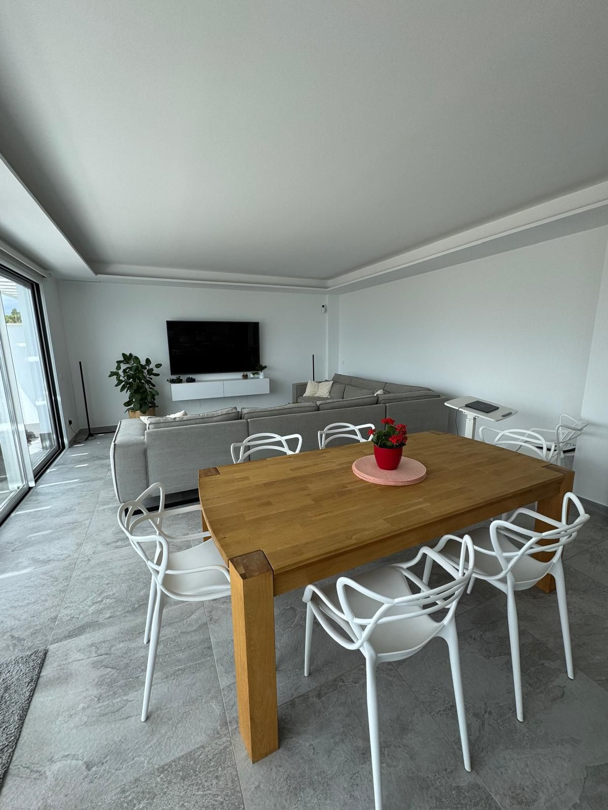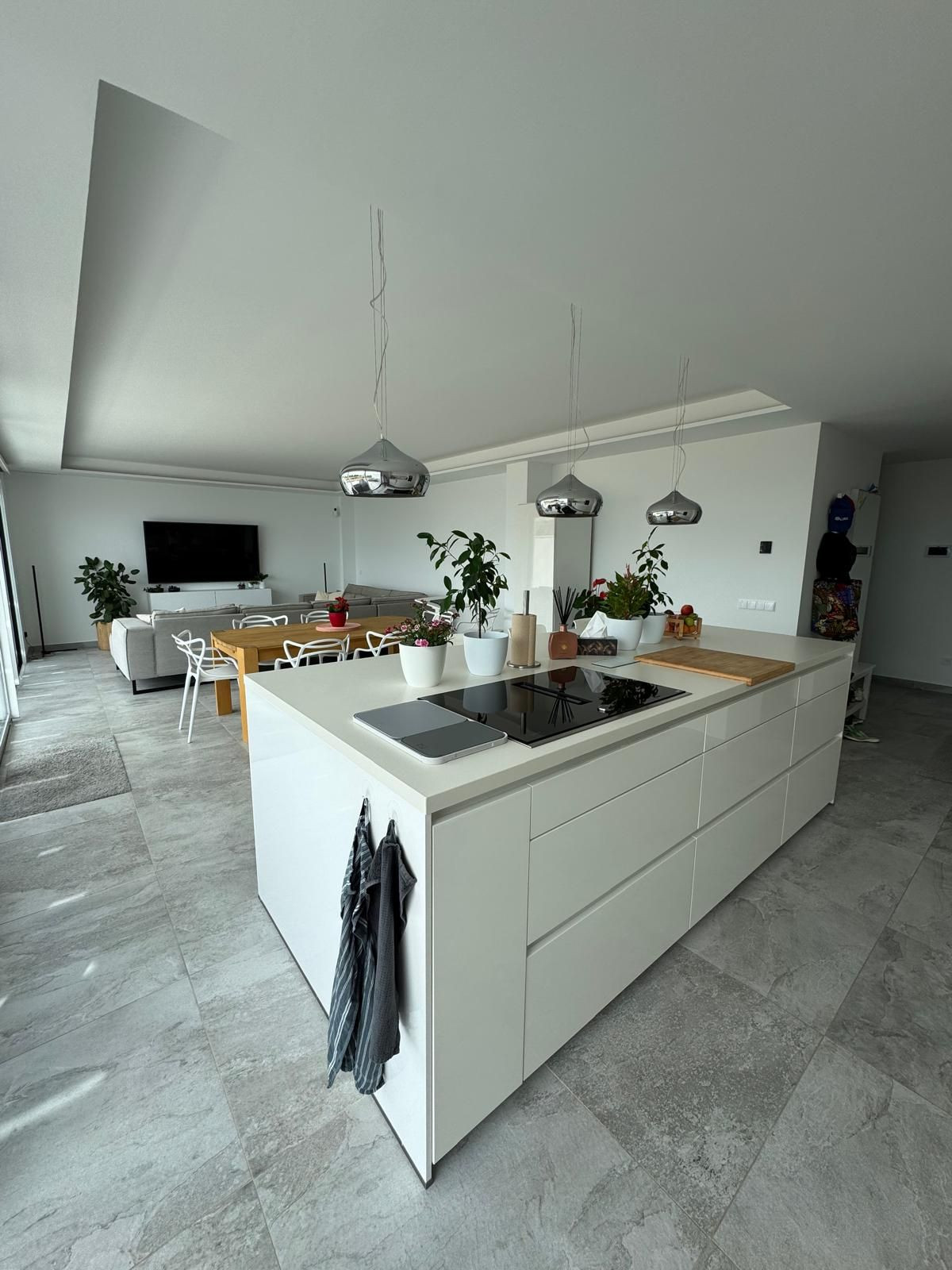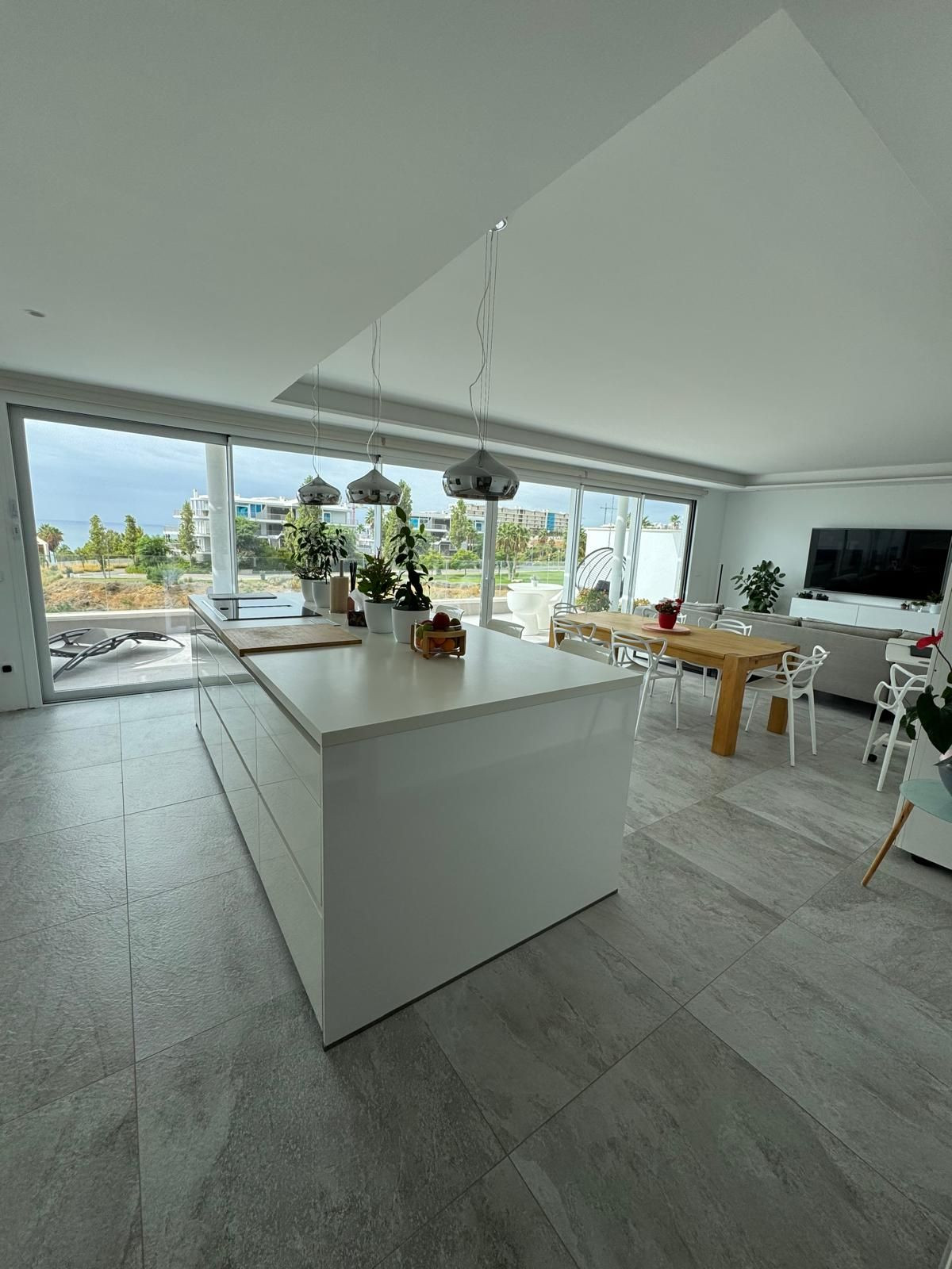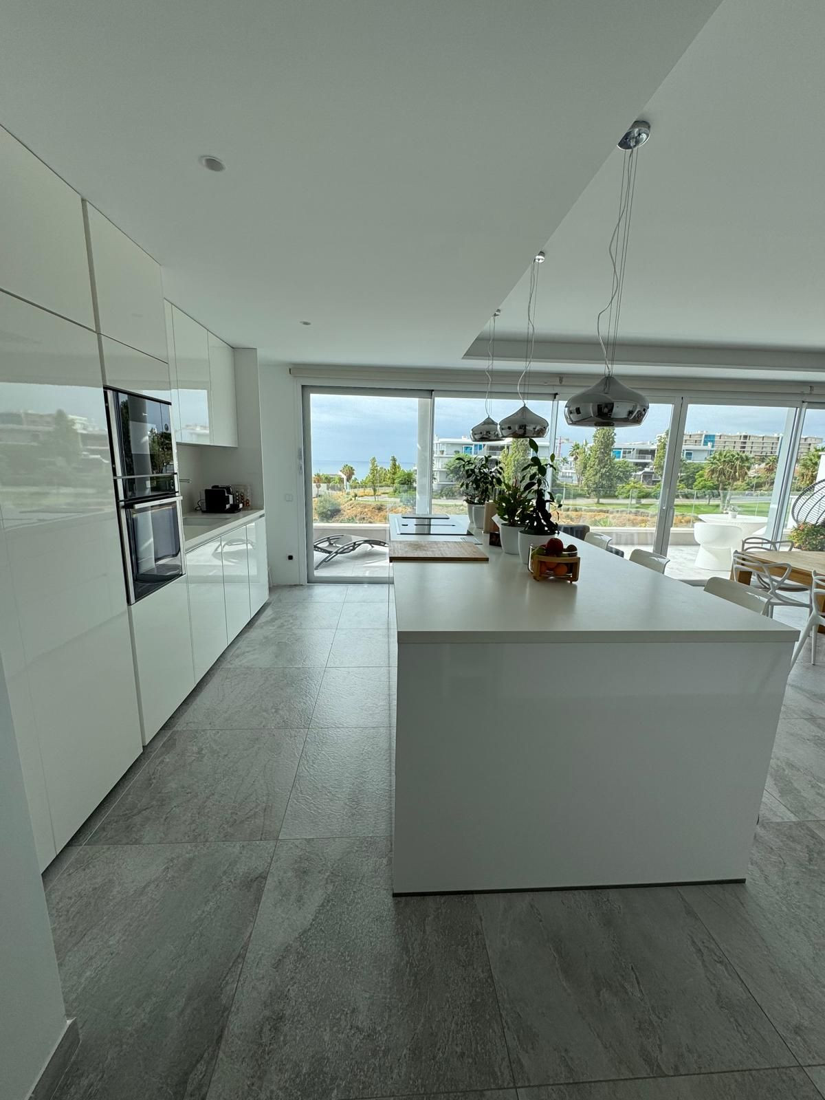 The modern kitchen equipped with top-of-the-line NEFF appliances also features a large island, connecting it with the bright living and dining areas. The living room terrace offers a tranquil space to relax or enjoy a sunset dinner, while the glass railing ensures unobstructed panoramic views of the sea.