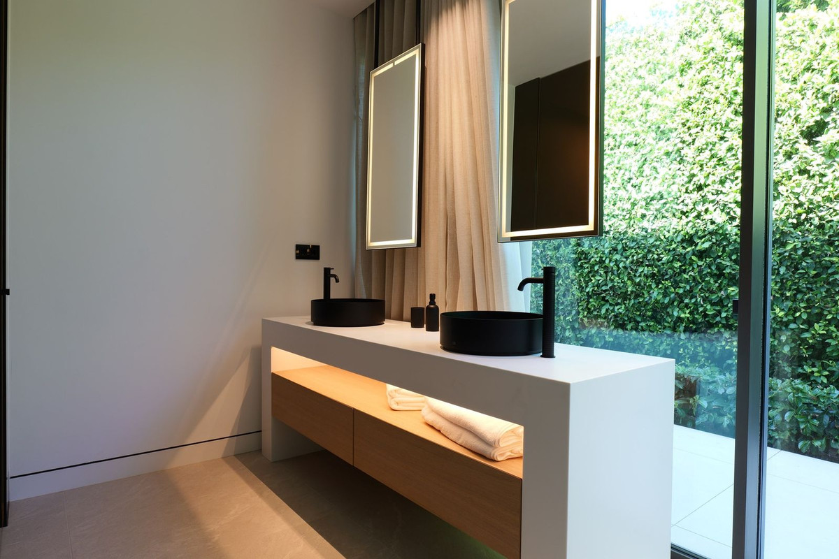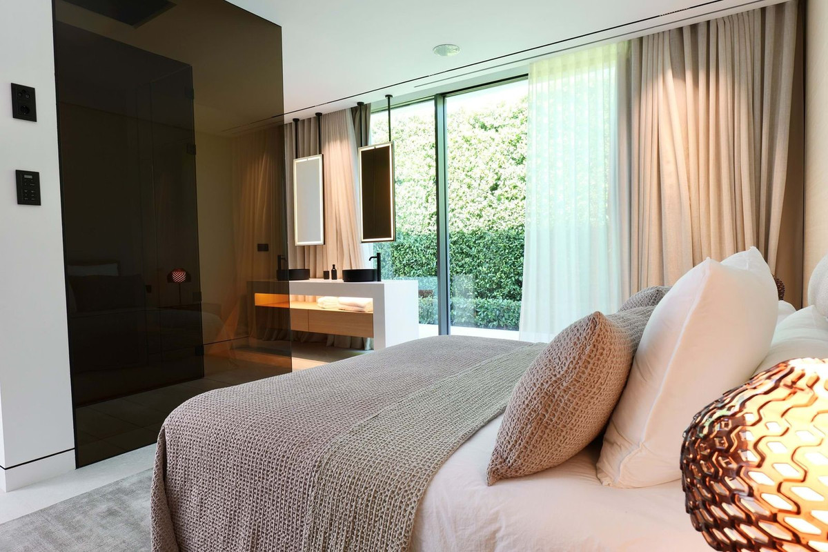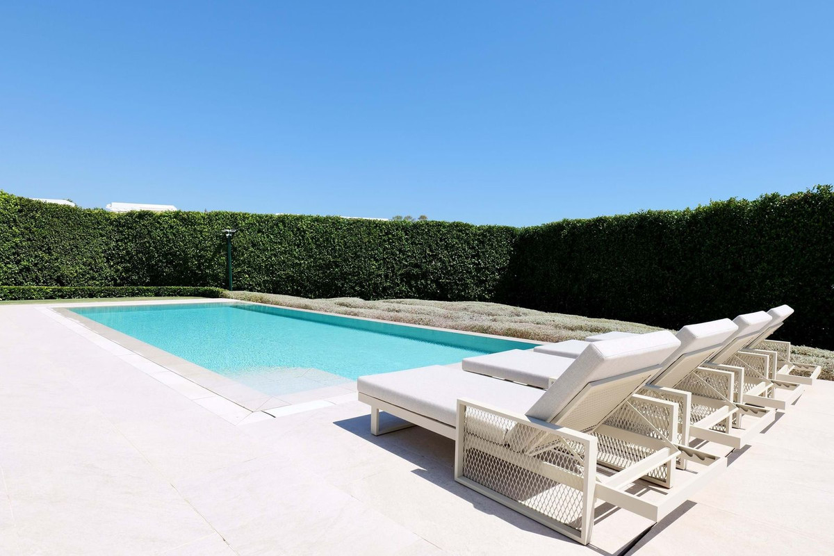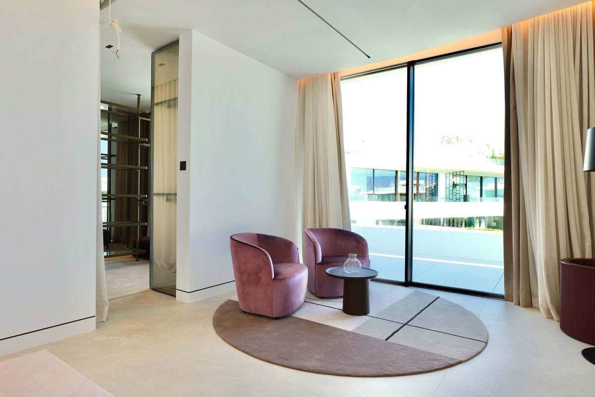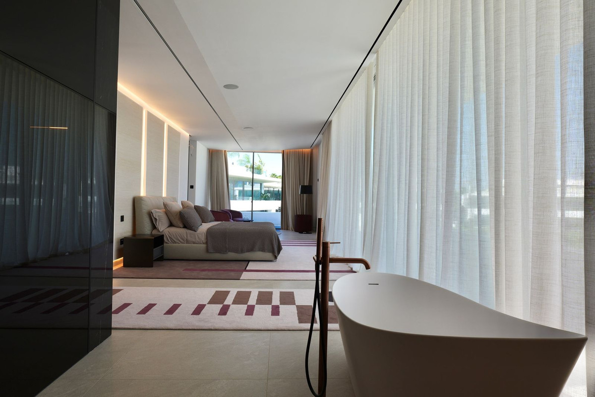 The villa features five spacious bedrooms, each with an en-suite bathroom and private terrace. The primary suite stands out as a true sanctuary with a walk-in closet and abundant natural light.