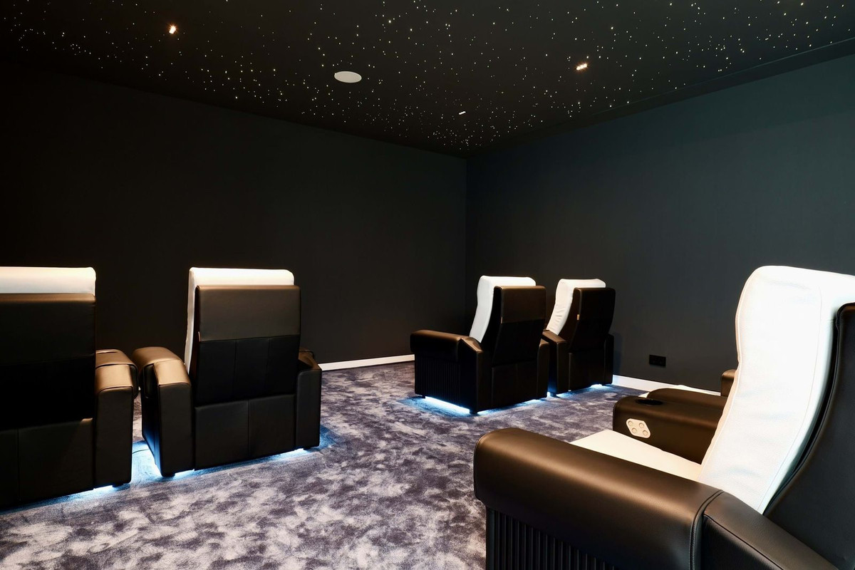 Upstairs, three bedrooms with private terraces enjoy panoramic sea and mountain views. The basement houses a cinema, bar, multi-purpose room, guest suite, laundry area, storage, and a garage for up to eight cars.