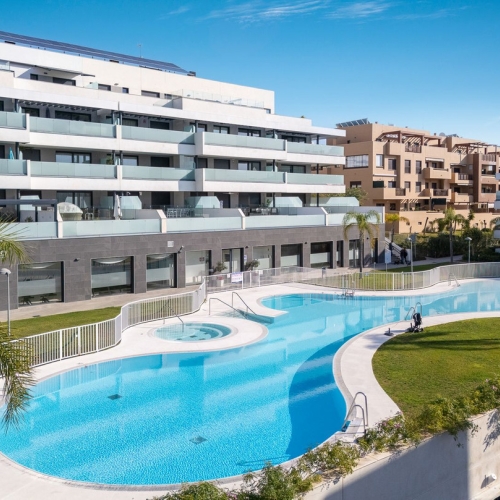 SECOND LINE BEACH. This is a lovely 2 bedroom penthouse apartment with fantastic pool, garden and sea views from the enclosed terrace and solarium. Situated in a great location very close to the beach and it is only a short, flat walk into La Cala centre and many restaurants, beach bars and shops. A good sized living room with dining area adjacent to the open kitchen, it is ideal for a holiday home or rentals. La Siesta is a well maintained, gated, secure complex with underground parking and lifts.