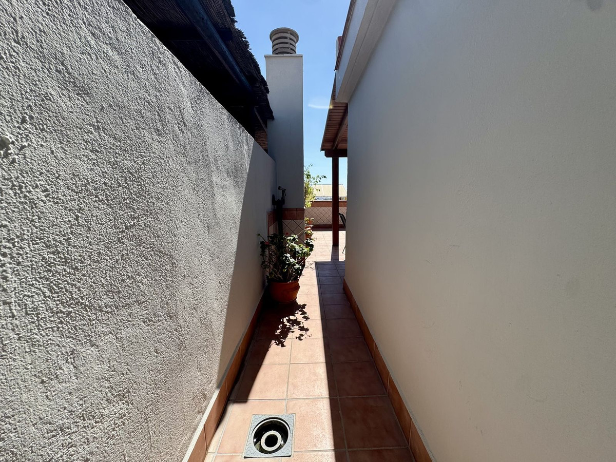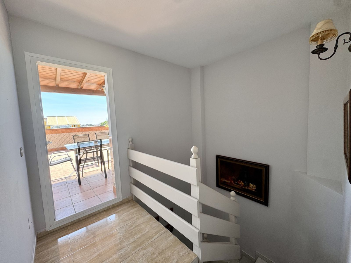 It is distributed over three floors: on the ground floor, there is a living-dining room with a fireplace, an independent kitchen, a bathroom with a shower, and access to a fully enclosed patio. On the first floor, there are three bedrooms with built-in wardrobes and a full bathroom. The top floor offers a laundry area and a spacious solarium with a pergola and storage room.