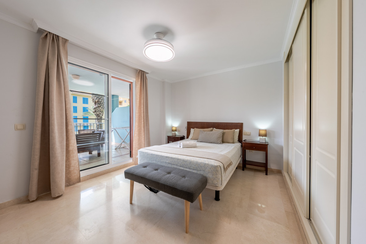 Step outside onto your private covered terrace and take in stunning views of the marina. The apartment is in a secure building with a lift and surveillance cameras, and you'll find a communal pool and garden to enjoy sunny days. No private garage, but there's easy access to transport and plenty nearby: shops, a children's playground, schools, the town, port, beach, and even golf courses are all close.