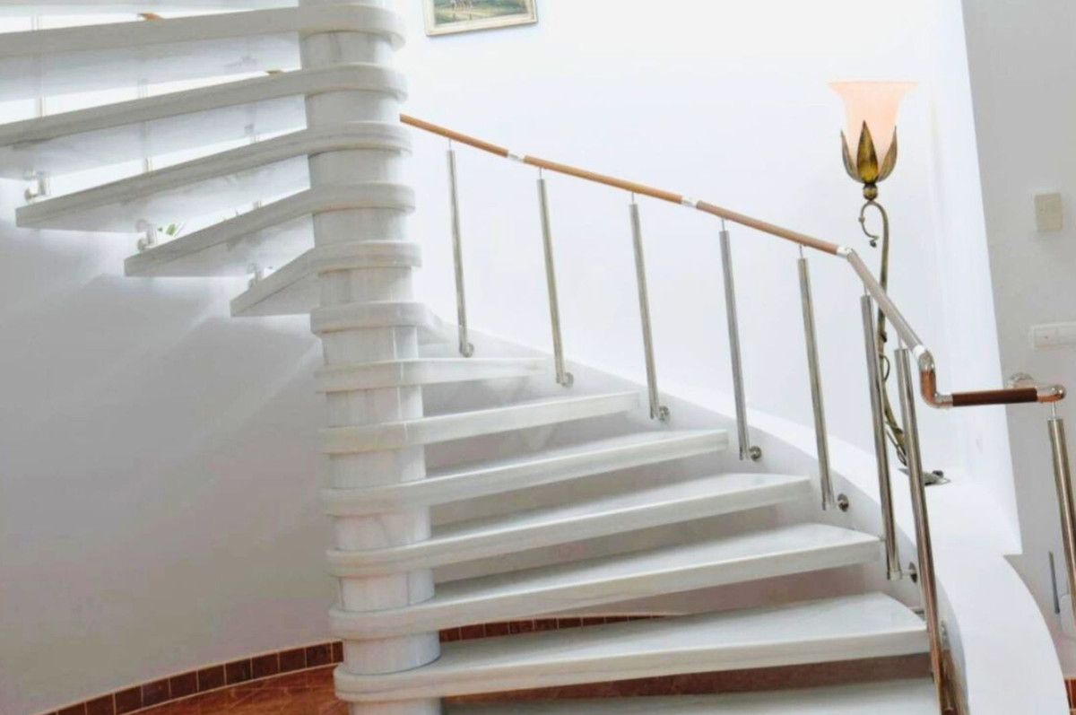 The main highlight of the house is, without a doubt, the magnificent marble spiral staircase, a valuable feature that ascends to the upper floor. From here, you are greeted with breathtaking views of the entire eastern coast of Málaga and the Mediterranean Sea, in a 180° panoramic angle.