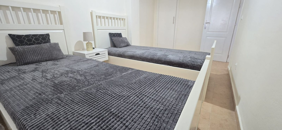 Inside, the apartment features an open-plan kitchen and living room, two double bedrooms, and a bathroom. The living room provides access to a good-sized private terrace that overlooks the community garden. There is a storage room included in the price