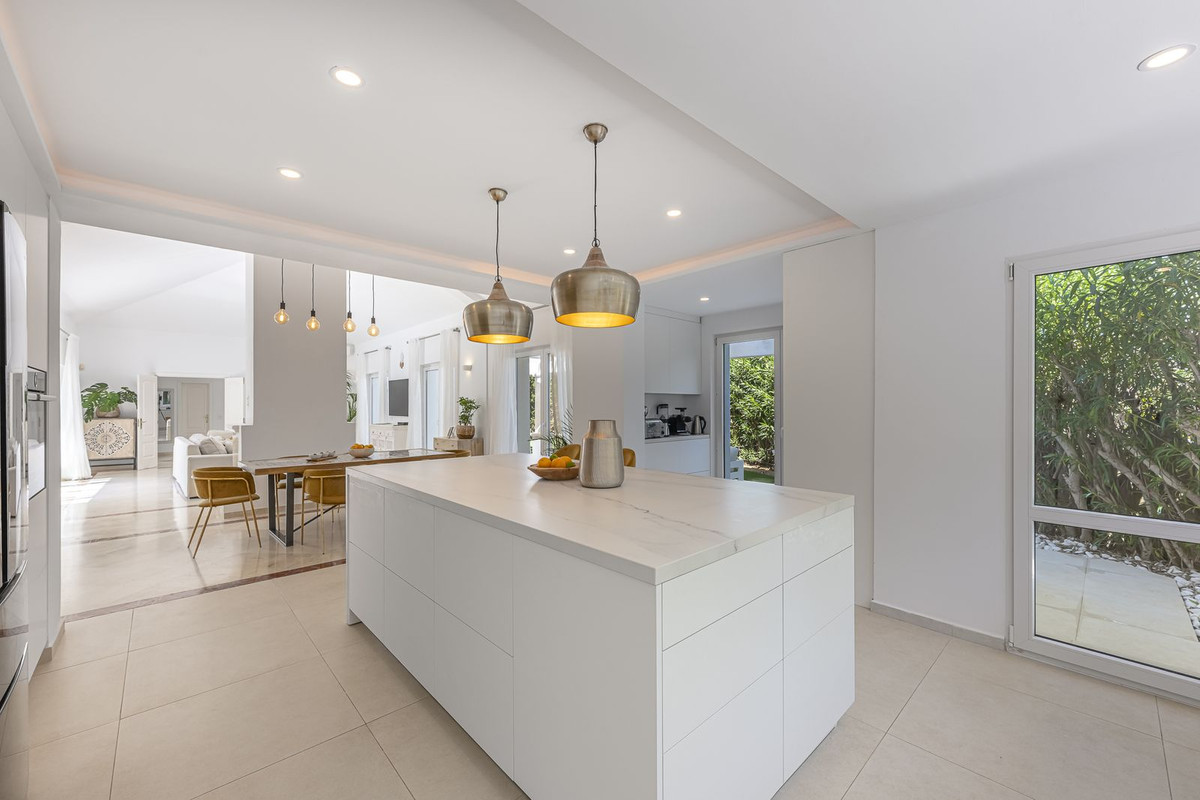 The spacious, open-concept living, dining, and kitchen area is filled with natural light and opens onto large terraces on either side of the house, providing ideal spaces for relaxing or hosting guests.