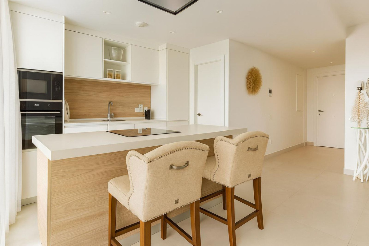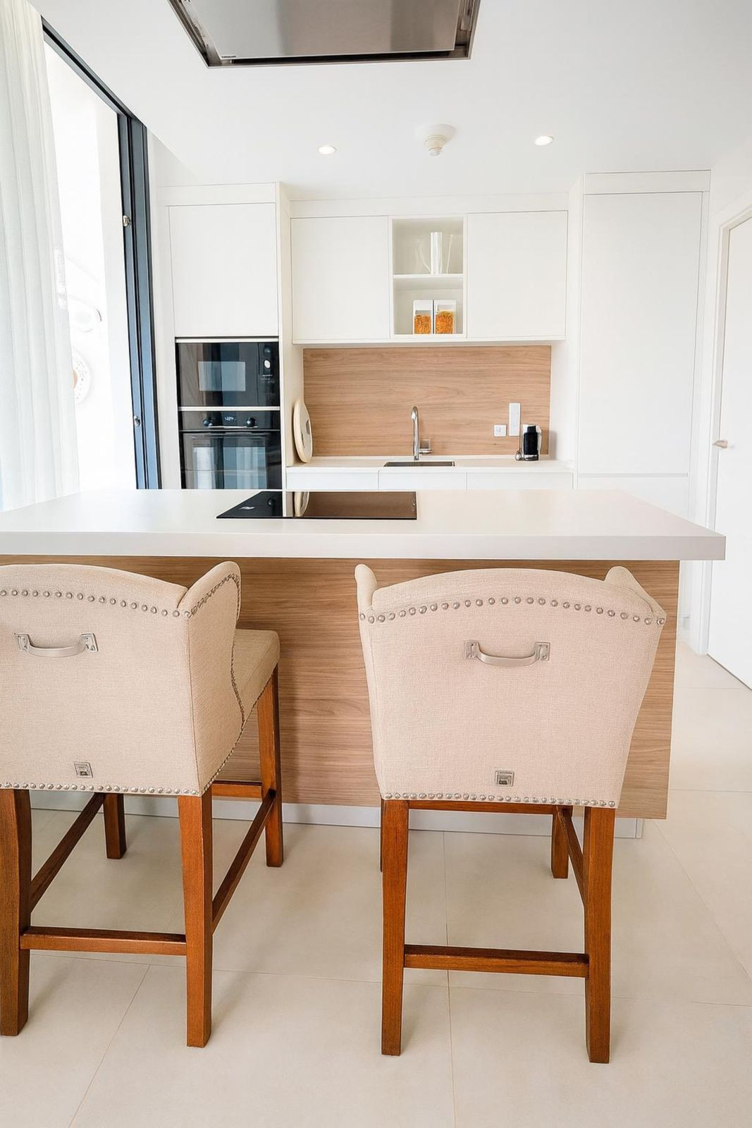 The spacious living and dining area connects seamlessly to the terrace, creating a bright and airy atmosphere. The master suite features its own en-suite bathroom and dressing area, while two additional bedrooms share a modern family bathroom. A fully fitted kitchen with premium appliances completes the layout, including a modern bar with barstools.