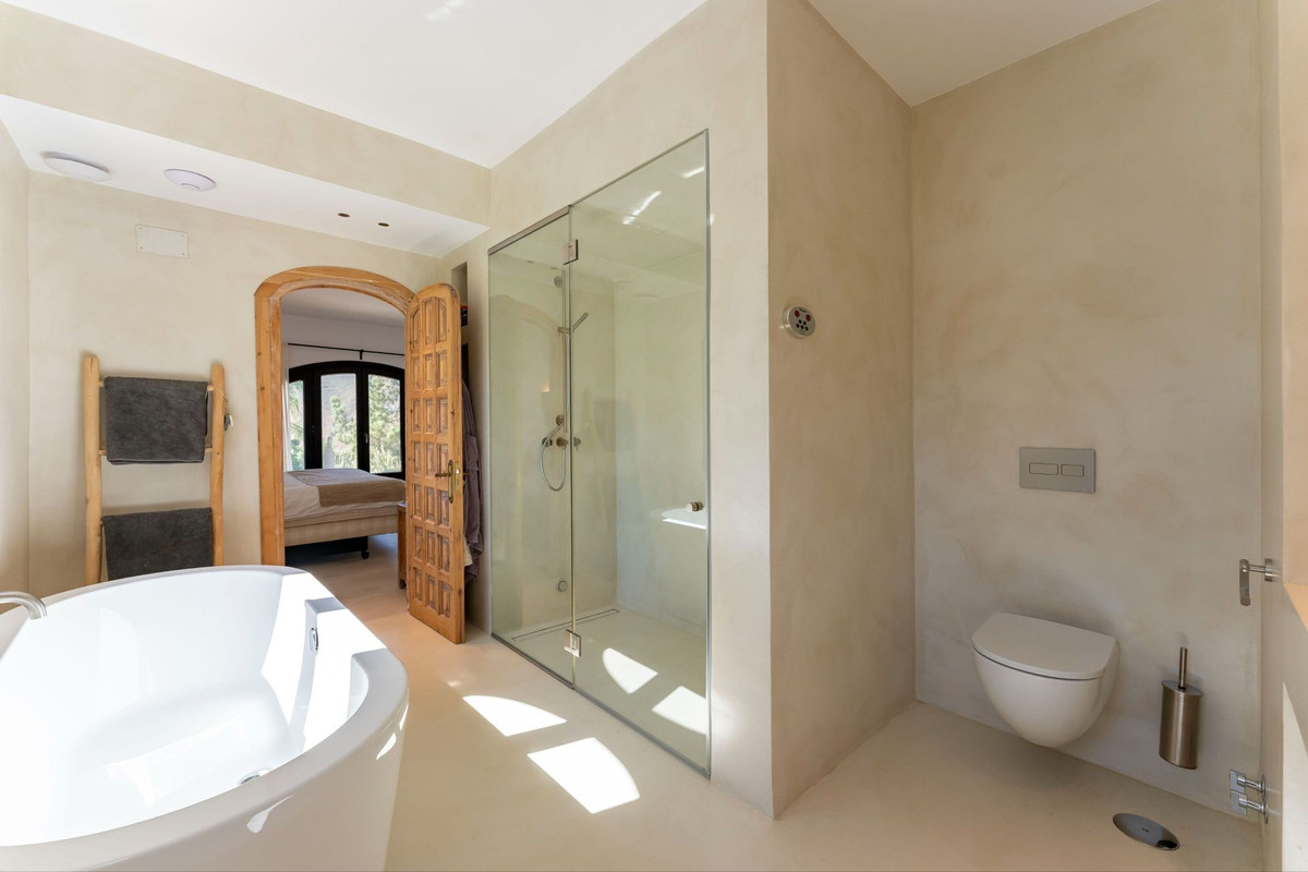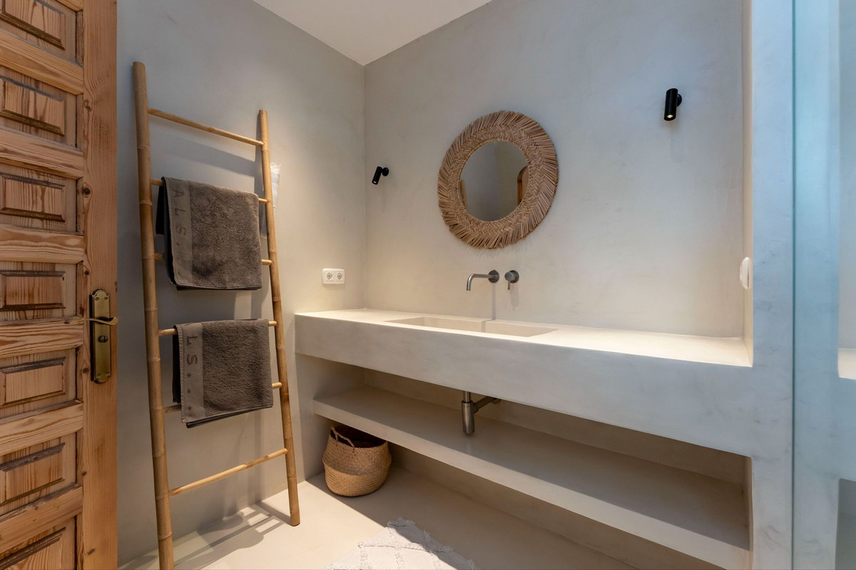 • Separate Ibizan-style guest house with courtyard, separately housed kitchen, bedroom, bathroom, and mezzanine level overlooking the living area