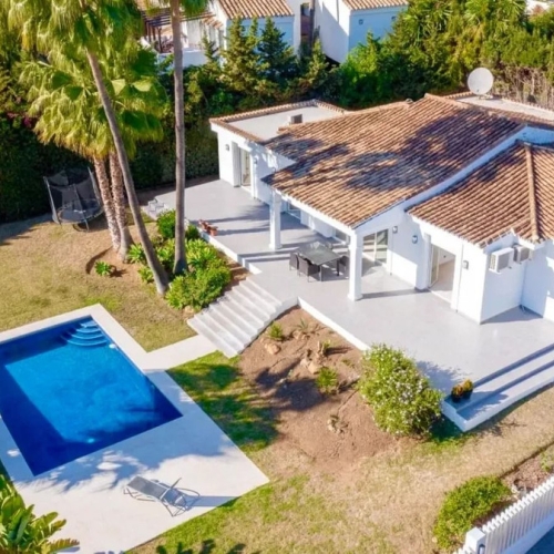 The villa is built over 2 floors with a spacious driveway and double garage. There are in total 5 bedrooms & 6 bathrooms and the property boasts a lovely mature garden and pool area.