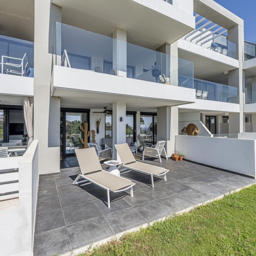 Entrance hall. Lounge-dining room with A/C h+c, ceiling fan and sliding doors to enclosed sunny terrace with folding glass curtains. Shower room. Master bedroom with wardrobes and sliding doors to the enclosed terrace. This sunny enclosed terrace could be a reading room or study if needed. Double glazing. Roller blinds. Marble floors. Ceiling fans. Guest bedroom also has fitted wardrobes. Full bathroom. Fully fitted kitchen with glass-ceramic hob, fridge-freezer, oven, extractor fan and granite counter-top. Small front patio has spiral stairs that lead up to spacious ROOF-TOP TERRACE with those outstanding PANORAMIC views to the whole coast. There are new storage units, an outdoor shower, and plenty of space for BBQ and dining "al fresco"– a great place to chill out. Communal swimming pool, well-maintained gardens and a designated parking space. All within a peaceful gated complex only a short walk from Mijas center. Walking distance to all amenities. Near bus stop. VIEWINGS RECOMMENED!