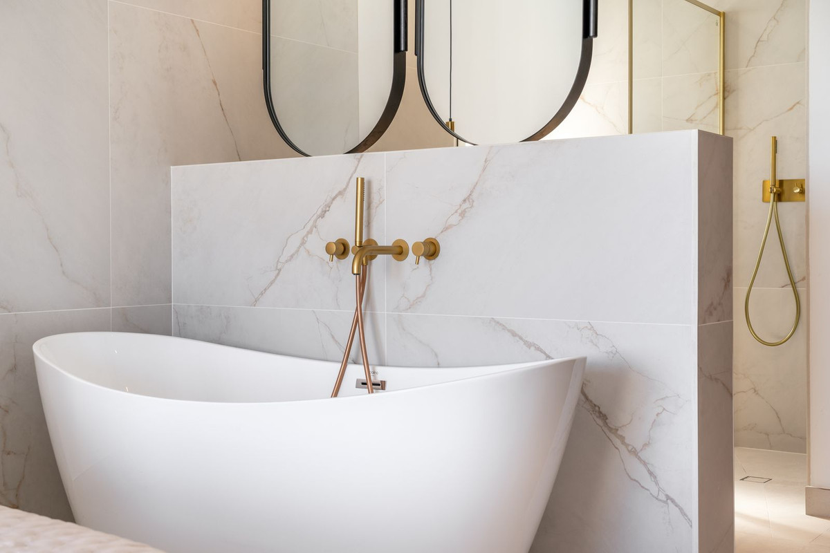 The master suite is conceived as a sanctuary, where a dramatic freestanding bath has been purposefully positioned to embrace sweeping views of both sea and landscape. Each bathroom is completed with luxurious Italian tiling, underscoring the property's refined aesthetic.