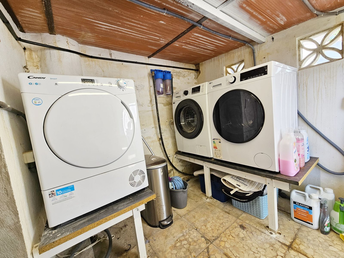 The villa sits on a generous, low-maintenance plot. The entrance level provides private parking for several vehicles and access to a secure garage. At the rear, you'll find a spacious covered terrace perfect for alfresco dining, alongside a large utility room. Steps lead up to the upper level, where a private swimming pool awaits, complete with another shaded seating area for relaxing or entertaining.