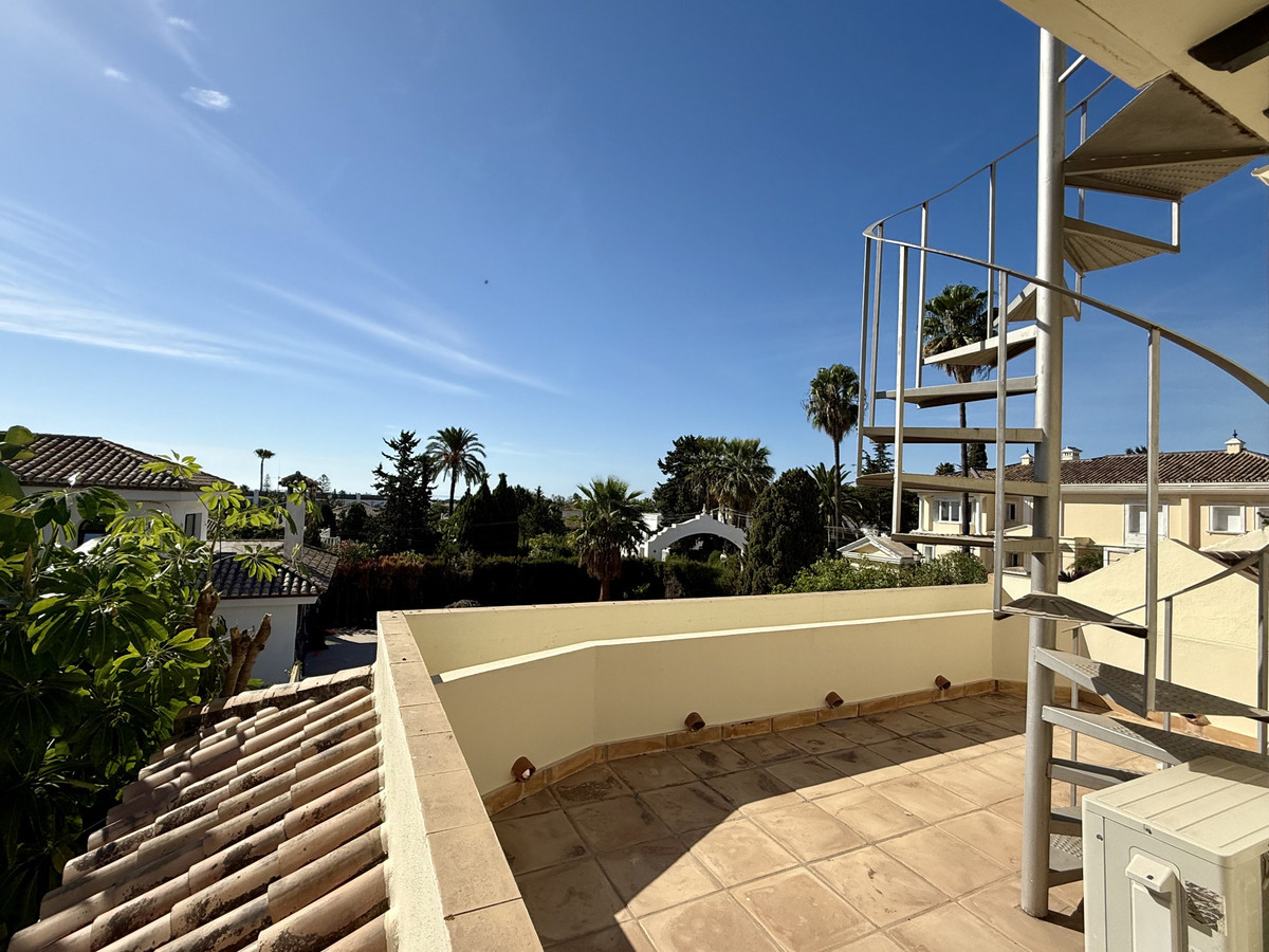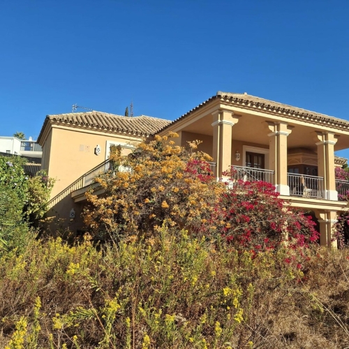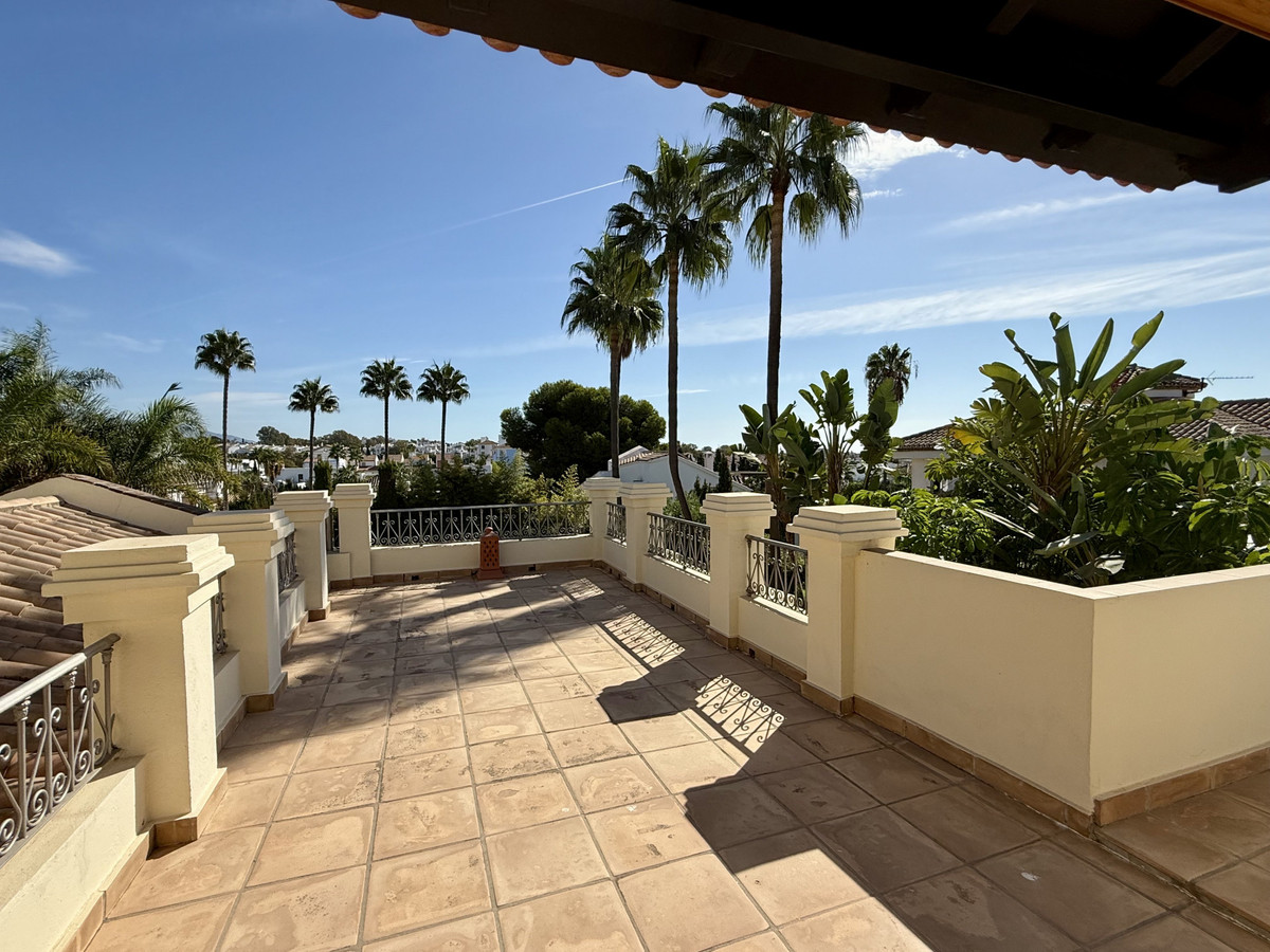 This great property has just come to the market at a very competitive price. It's an Ideal location, walking distance to several commercial centers make it very desirable for those who don't want to take the car to enjoy facilities and restaurants, supermarket, pharmacy, gym or a nice coffee shop. The property is in a lovely condition. The villa has a nice elegant andalusian style. The entrance hall connect to the right with the separate dining room, the fully fitted kitchen ad the large covered and uncovered terrace to the landscaped mature and very private garden and pool. The spacious living room has a high ceiling with wooden beams. On the same level we find two bedrooms with en suite bathroom. A nice stair case bring us up tot he first floor where we find a large and very bright bedroom and the master bedroom with , ensuite bathroom and access to a large very sunny uncovered terrace with lovely mountain views. Going down to the basement we find a games room, a hobby room with bathroom and the very large garage for several cars. Also the utility room. This great family property enjoys a fantastic mature garden and a lovely entrance area. International schools like Atalaya, San José in Guadalmina are just nearby. Proximity to all facilities as several golf courses like El Paraiso, Atalaya or los Flamingos, the beach at 15 minutes walk, The lovely El Campanario sport club with fantastic indoor pool, gym, spa and much more make this a unique family home. A visit is highly recommended.