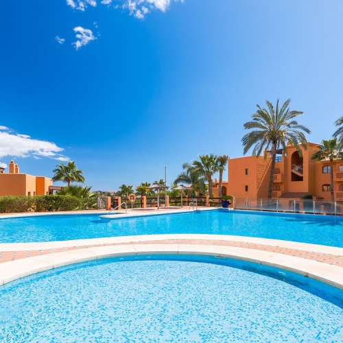 The huge south facing terrace that has access from both bedrooms as well as the spacious saloon. The property has electric blinds as well as access to the facilities such as large free form swimming pool, indoor heated pool, gymnasium, Sauna etc