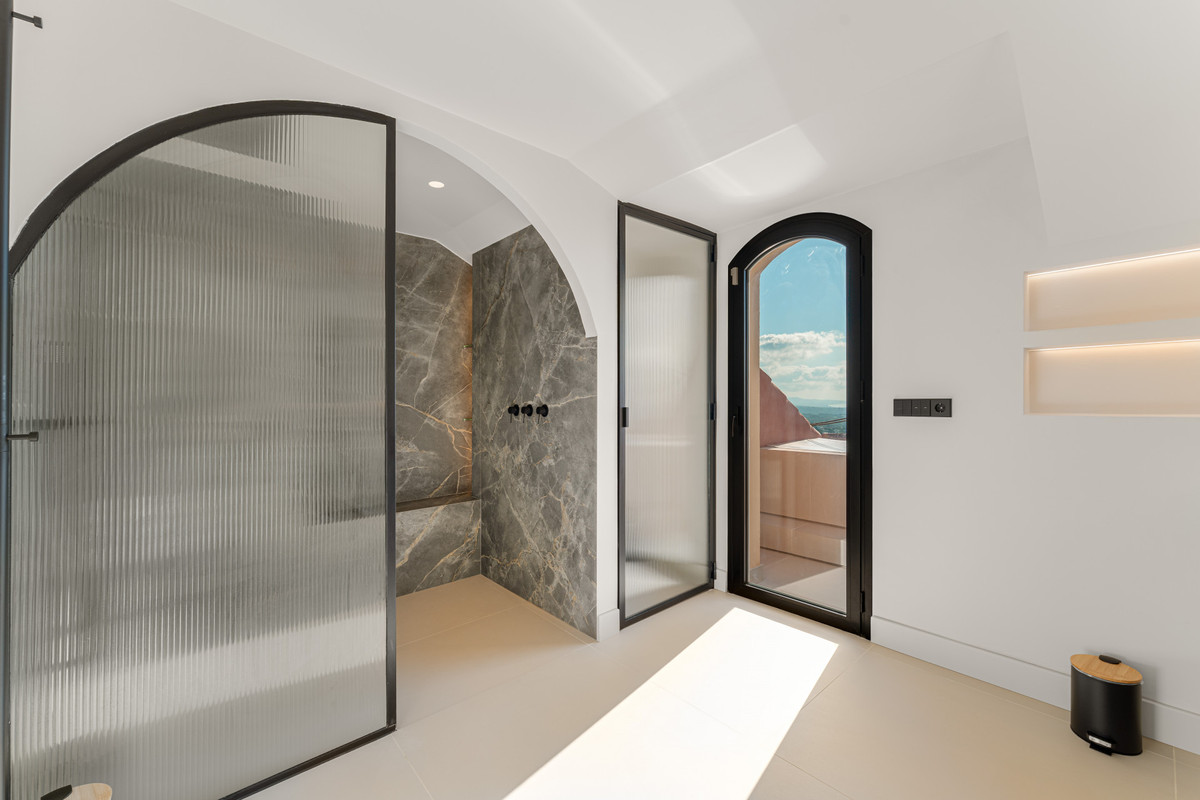 The duplex is arranged across two floors. The ground level hosts three beautifully designed bedrooms, each with ensuite bathrooms that combine style with convenience. An additional guest toilet ensures functionality for visitors. The upper floor is devoted to the master suite, where a private terrace and Jacuzzi create a sanctuary of privacy and relaxation, perfectly complemented by stunning views across Benahavís and the coastline. In total, the property offers four bedrooms, one of them is set up as an office, three bathrooms, and a guest toilet, making it ideal for families or those who enjoy hosting guests.