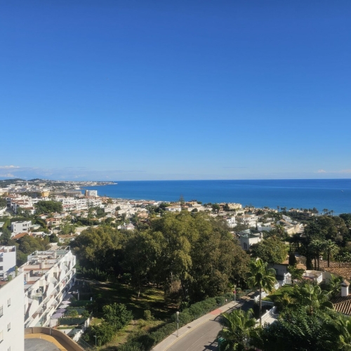 Situated in the sought-after community of Miraflores, this two-bedroom penthouse is just a 15-minute stroll from El Bombo beach in La Cala. The standout feature is without doubt the expansive 123m² wraparound terrace—larger than the apartment itself—boasting uninterrupted sunshine and spectacular views across the Mijas mountains.