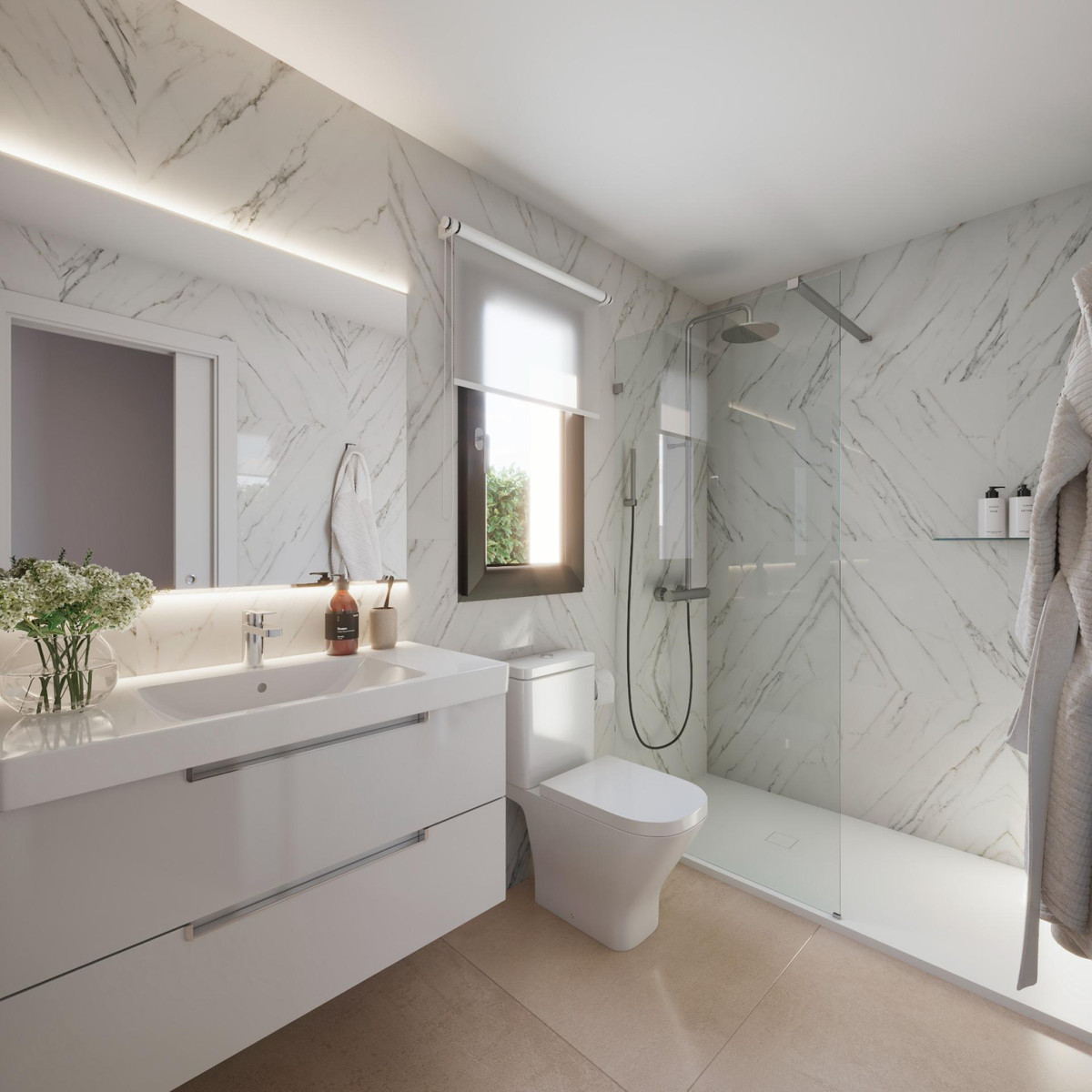 This new-build project features high-quality finishes, such as white lacquered interior carpentry, porcelain stoneware flooring, and aluminum exterior carpentry with Climalit double glazing. Additional features include pre-installation of ducted air conditioning and heating throughout the home, as well as built-in wardrobes.