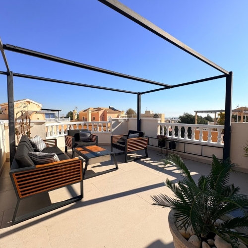 Fantastic apartment with panoramic sea views on the first line. Second floor, south facing. 91m2, three bedrooms, two complete bathrooms (one en suite), an independent equipped kitchen, living-dining room and 15m2 of the terrace. A/C in the living room. Sold partially furnished. The residential complex with a swimming pool is located just above the Aguamarina and Campoamor beaches, with direct private access to the beach. The apartment has parking place and storage.~~The sale price does not include tax (ITP - current rate according to autonomous community)