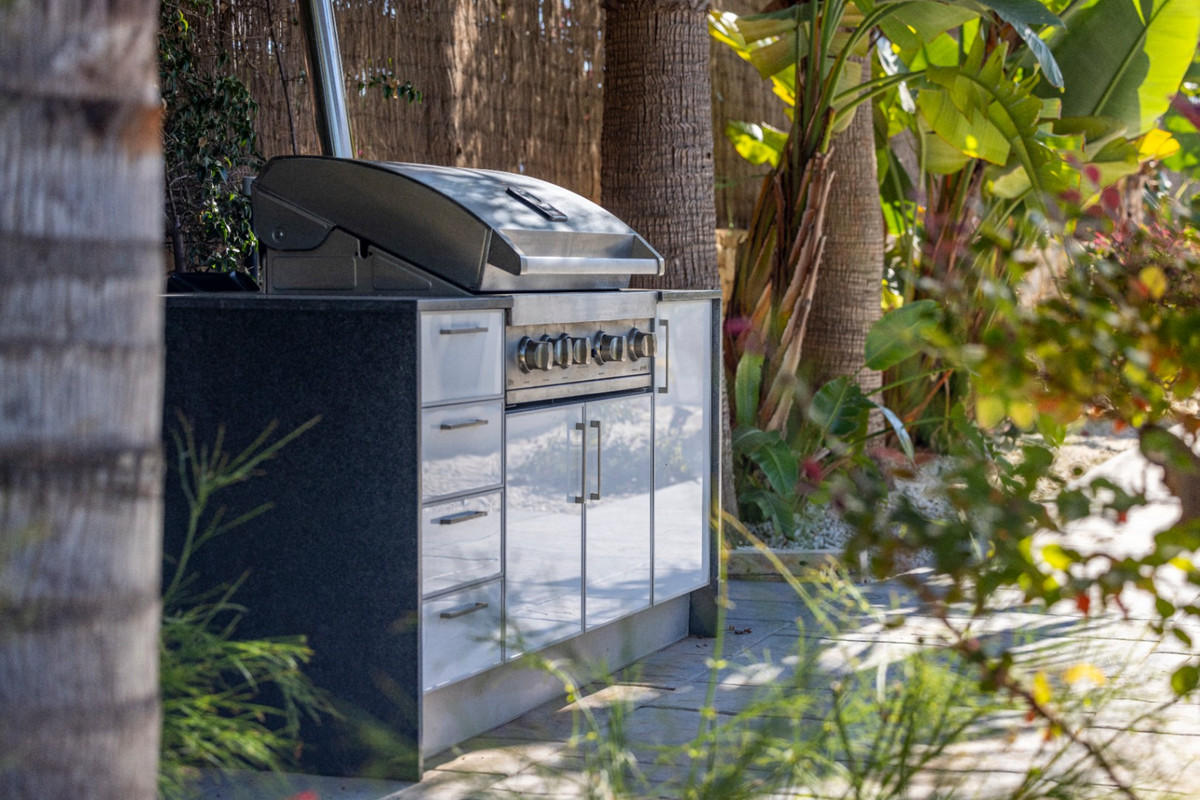 The garden includes a private entertaining area with barbecue, surrounded by landscaped grounds that ensure privacy.