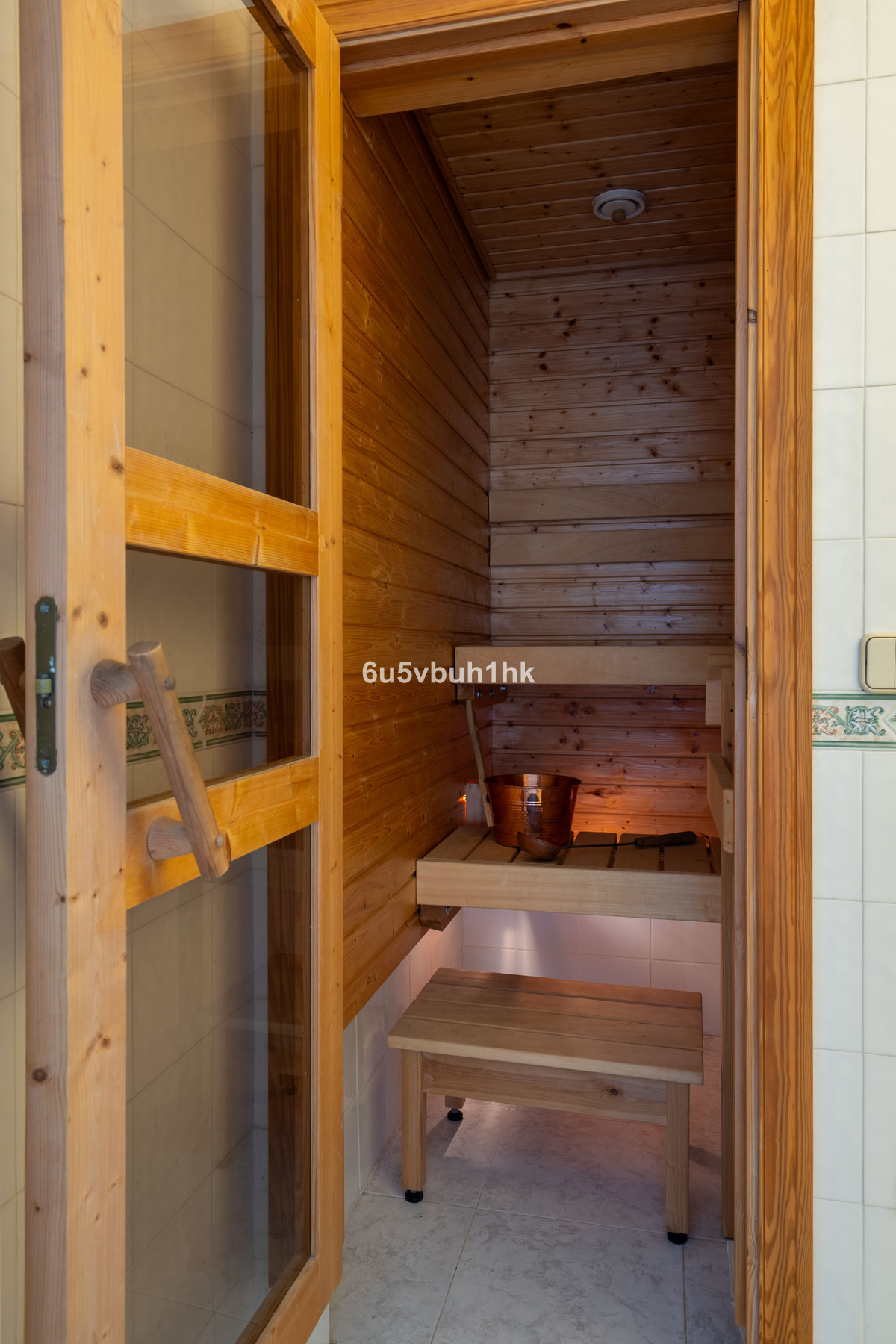 On the lower floor, you'll find two more bedrooms, a bathroom, a laundry room, and even a private sauna. From here, you can access the back patio, which can also be used as private parking.