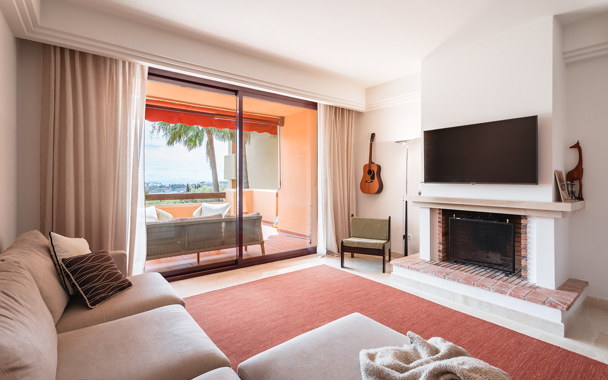 Bathed in natural light, the apartment features a generous living and dining area with working fireplace, that opens onto a partially covered terrace with panoramic views across the Mediterranean, Gibraltar, and Africa; a fully equipped, independent kitchen with ample workspace and well compartmented spacious cabinets; two generous sized en-suite double bedrooms with fitted wardrobes and with the master enjoying direct terrace access; as well as a guest toilet that adds convenience for visiting friends and family.