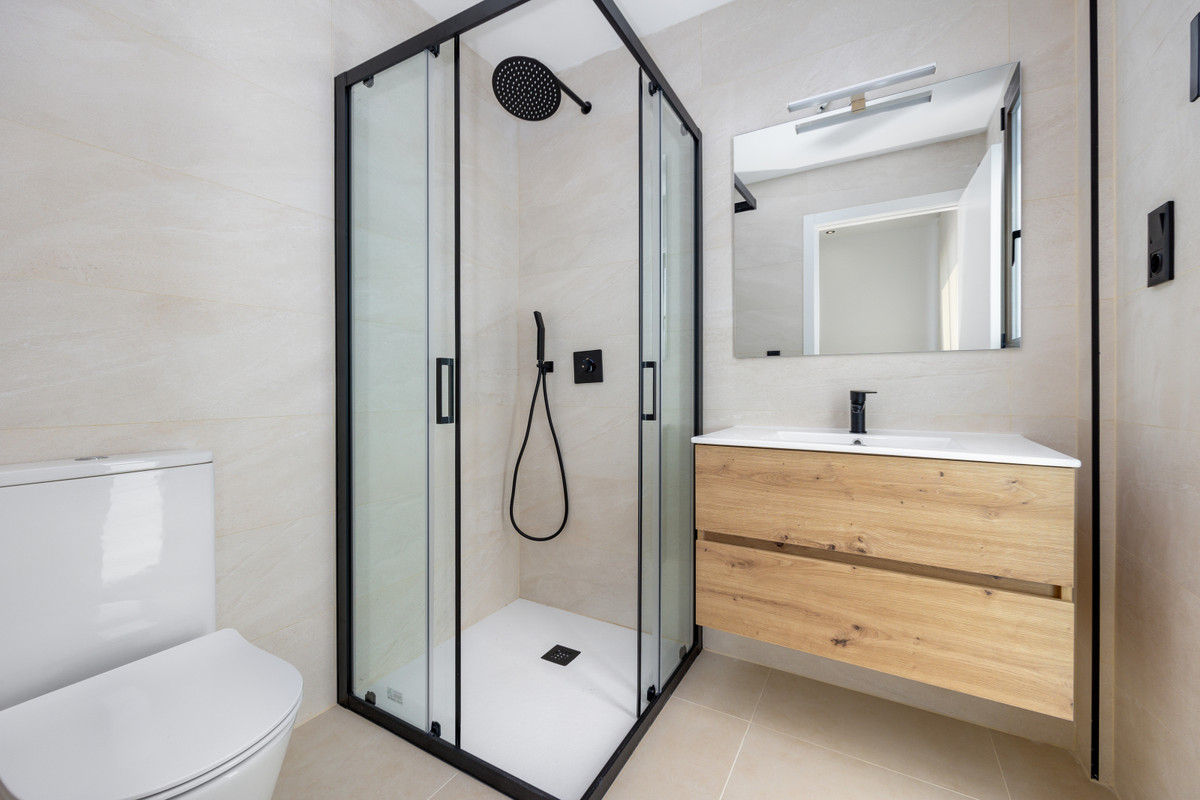 Bathrooms feature resin shower trays, glass screens, black built-in shower fittings, suspended porcelain washbasins with cabinets, mirrors, and black single-lever faucets.